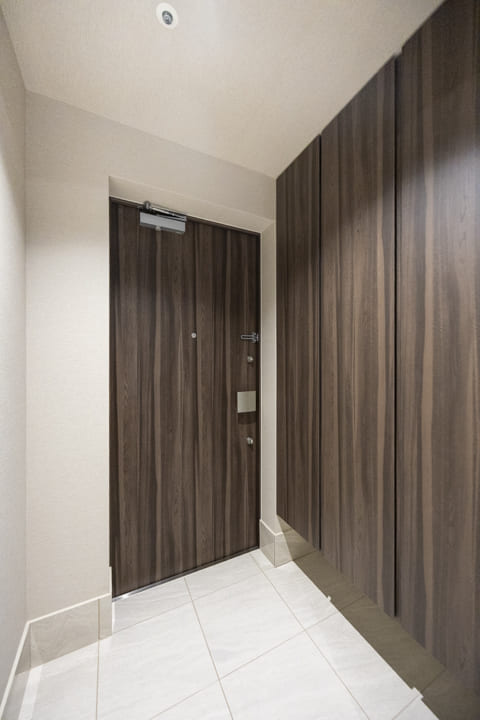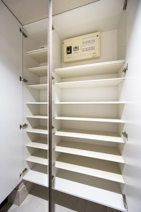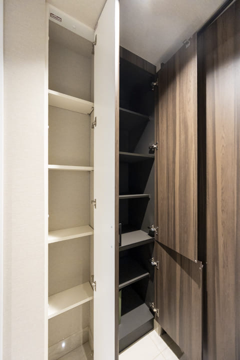 足元に空間を設けたフロートタイプのシューズボックスが、玄関に軽やかですっきりとした印象をもたらします。内部は自由度の高い可動棚仕様となっており、ロングブーツから雨具などの高さのある荷物まで効率よく収納可能。機能的な収納で空間を美しく保ち、住まいの顔として常に清々しく家族やゲストを迎えます。
