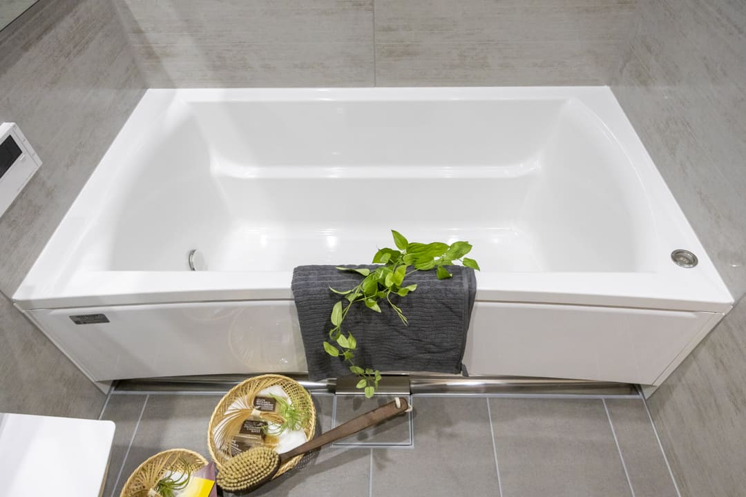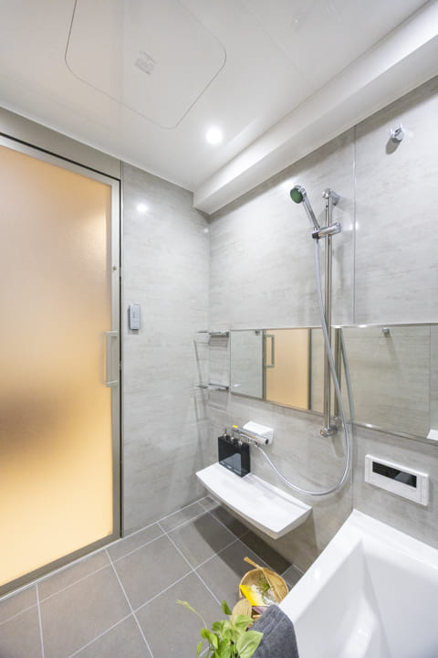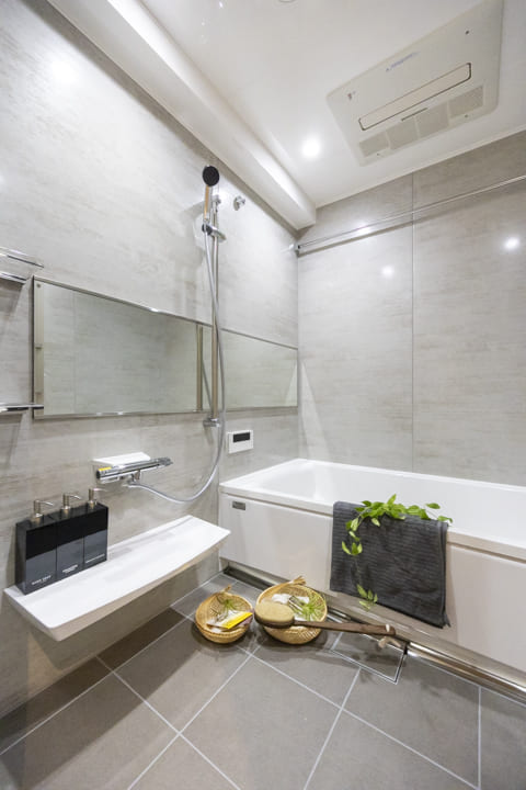石柄の内装とワイドミラーが、開放的で上質な空間を演出するバスルーム。浴室換気乾燥暖房機や追い焚き機能で、一年中快適なバスタイムを過ごせます。照明には調光・調色機能を備えており、その日の気分に寄り添う明かりで心ゆくまでリラックスできるのが魅力です。