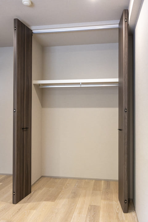 約6.2帖の寝室2。南向きの窓から心地よい光が差し込み、外に広がる豊かな緑が日常に安らぎを添えます。壁面には大容量のクローゼットを完備しており、衣類から日用品まで集約して収納できるため、室内を常にすっきりと保てるのが魅力です。