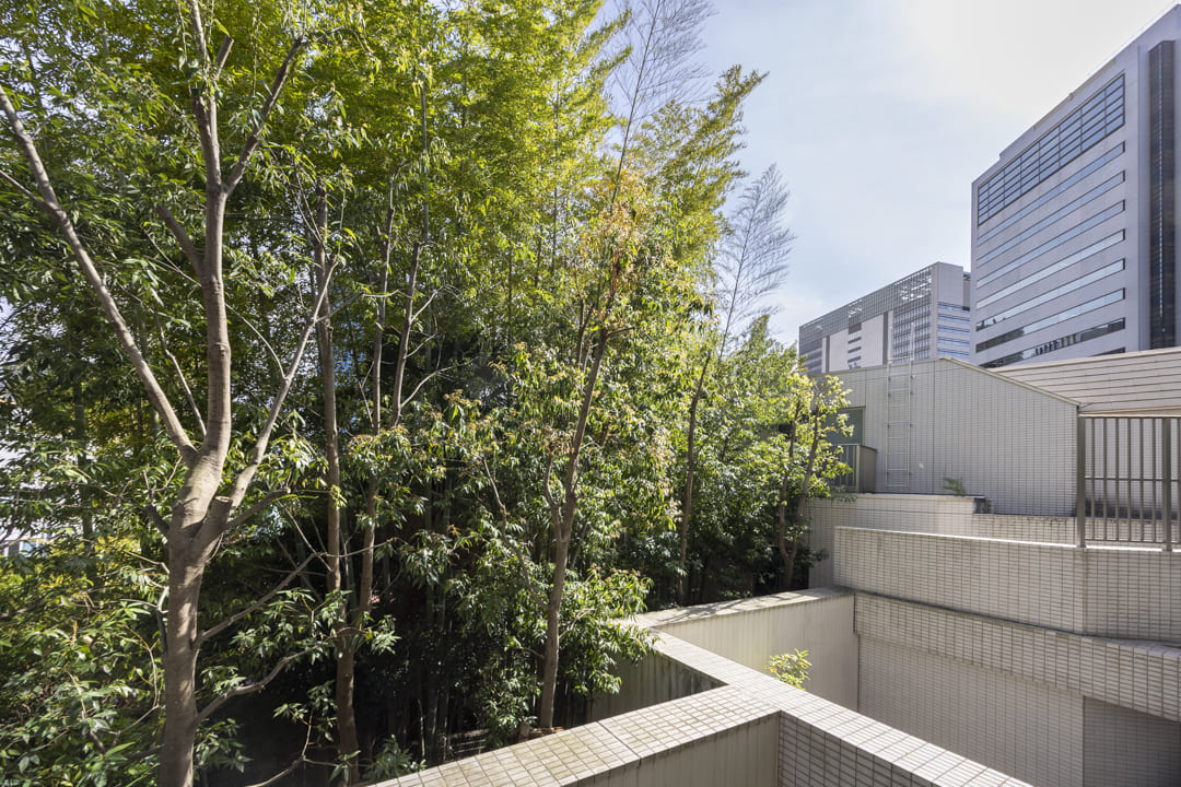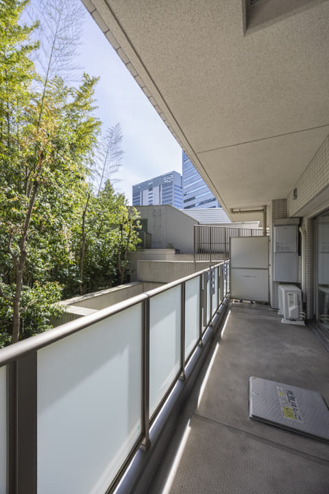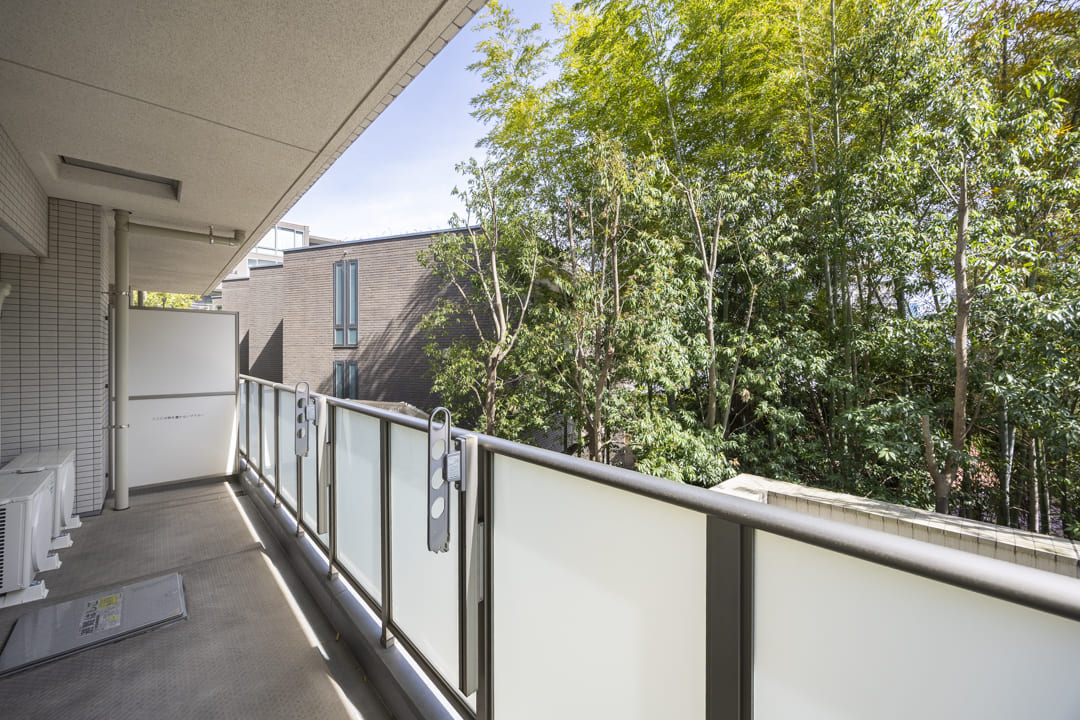 あたたかい南向きの太陽光が差し込む、11.07㎡のゆとりあるバルコニー。LDKからスムーズに出入りできるほか、隣接する寝室2もバルコニーに面しており、住まい全体に心地よい開放感をもたらします。バルコニー越しに見える豊かな植栽が、プライバシーを守りつつ、日々の暮らしに安らぎを添えてくれます。
