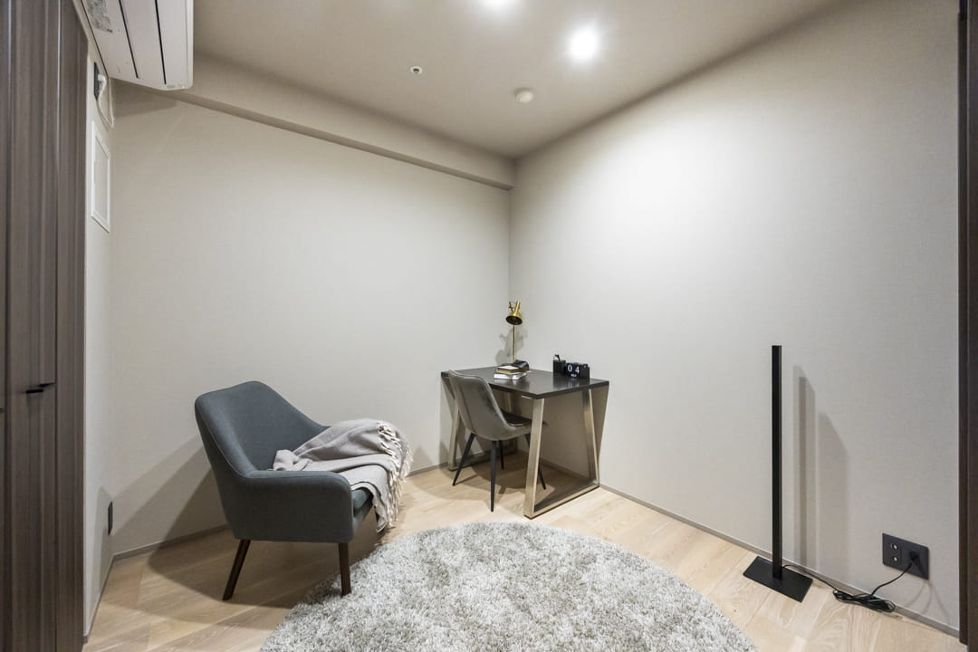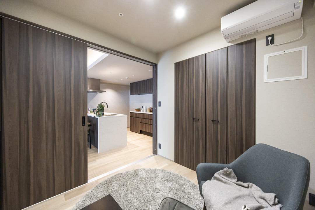 約4.0帖の寝室3は、LDKと引き戸で仕切られたフレキシブルな空間。扉を閉めれば静かなワークスペースとして、開け放てばリビングと一体感のある広々とした空間として活用いただけます。キッチンからも目が届きやすいため、お子さまのプレイルームにも最適。コンパクトながらクローゼットも備え、収納スペースもしっかり確保されています。