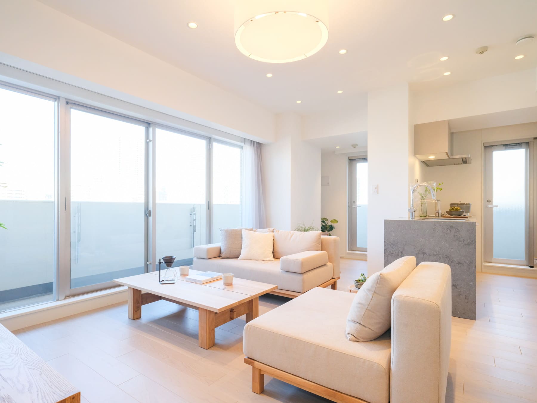 バルコニーに面した二面採光により、明るく開放感のあるLDK。約20.2帖の広々とした設計です。木目の風合いを活かしたナチュラルな内装に、アクセントウォールが落ち着いた雰囲気を添えています。壁面にはピクチャーレールを備えており、お好みのインテリアを気軽に飾れるのも特徴です。
