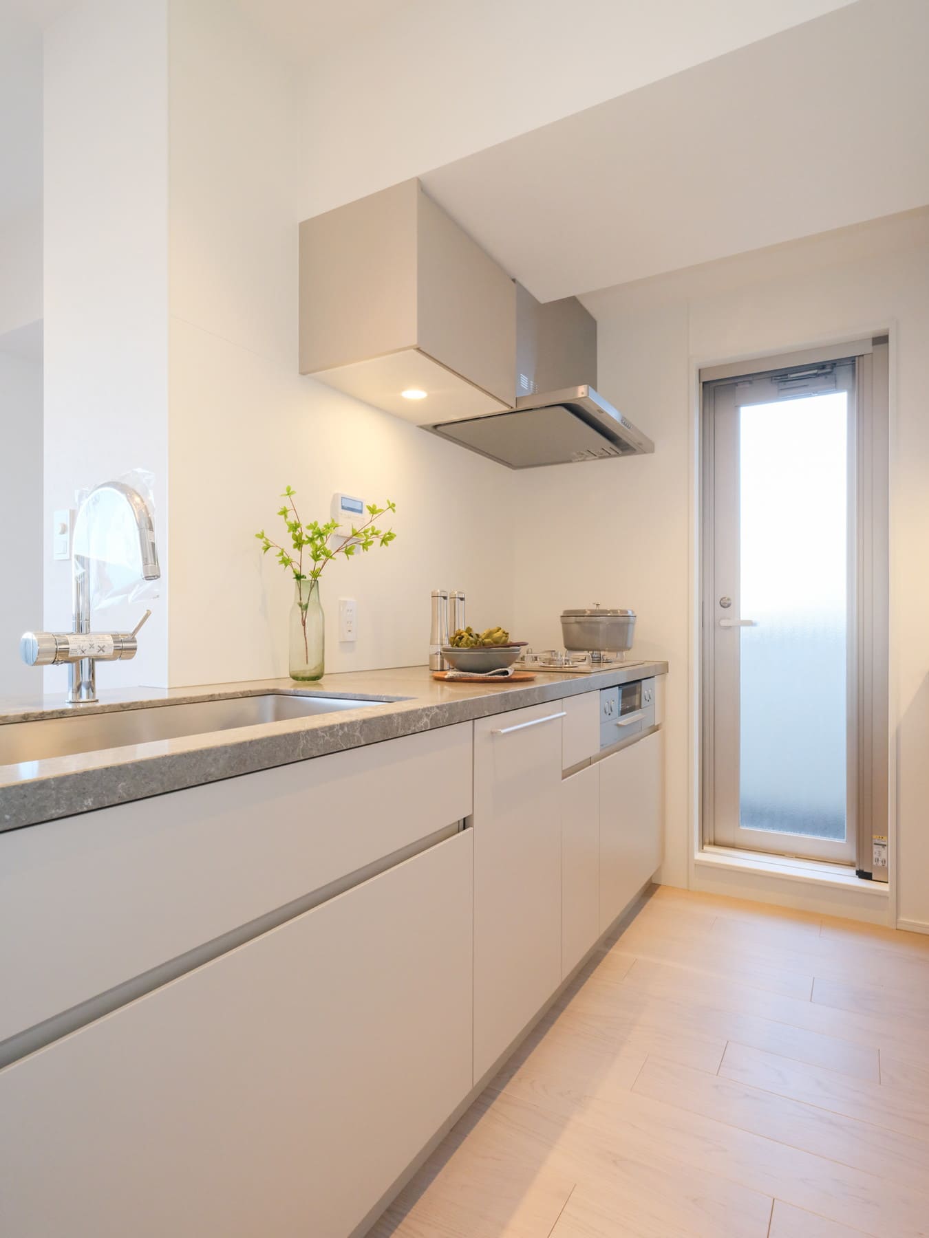 ほど良い独立感を備えたキッチン。シンク側からリビングダイニングの様子を見渡せるため、家族と会話をしながら調理が可能です。コンロ側からはバルコニーへダイレクトに出入りできる設計で、家事効率を高める機能的な動線も実現しています。グリル付3口ガスコンロ・食洗機内蔵で設備も充実しています。