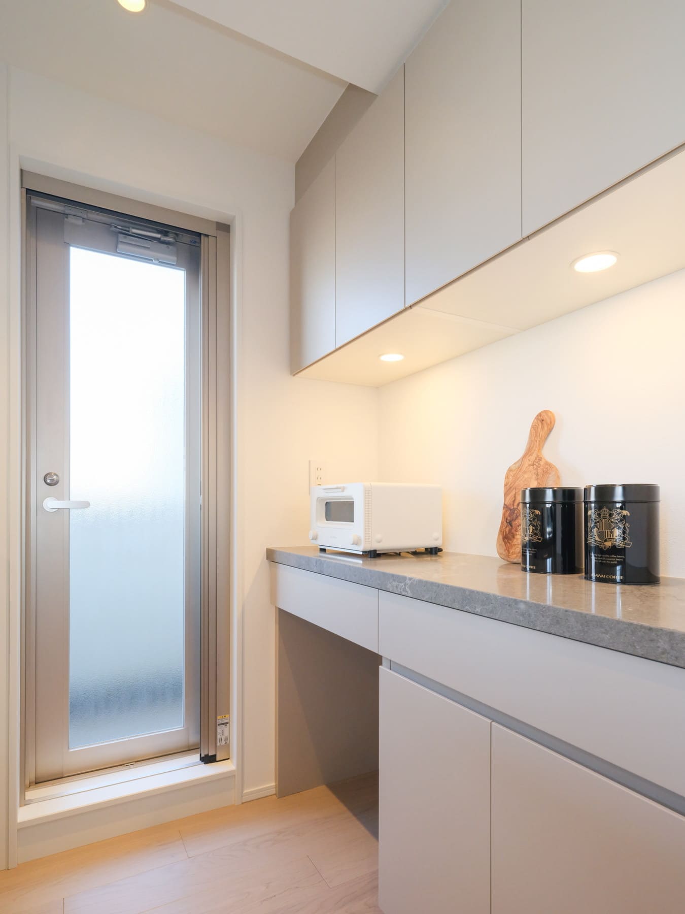 背面にはキッチンとデザインを揃えたカップボードを設置。統一感のある美しい空間を保ちながら、食料品や食器類をすっきり収納できます。カウンターにはコンセントも設けられており、家電の使用にも配慮されています。