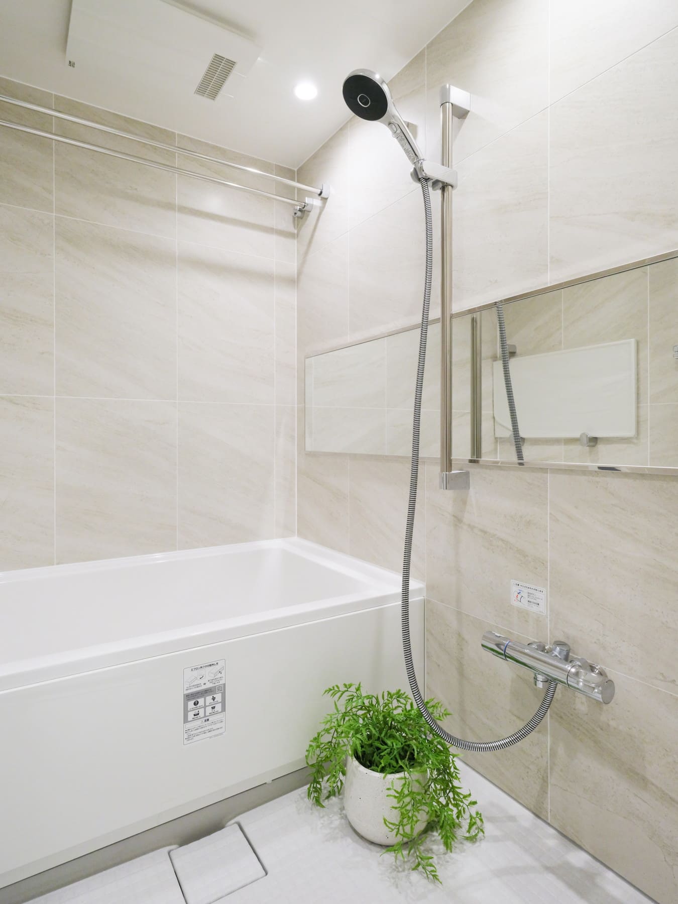 タイルデザインとワイドミラーが上質な空間を演出する、LIXIL製のバスルーム。寒い日も快適に入浴でき、カビ対策や雨の日のお洗濯にも活躍する浴室換気乾燥機を搭載しています。追い焚き機能も備わっているため、家族の入浴時間がずれた際や半身浴を楽しみたい時にも便利です。