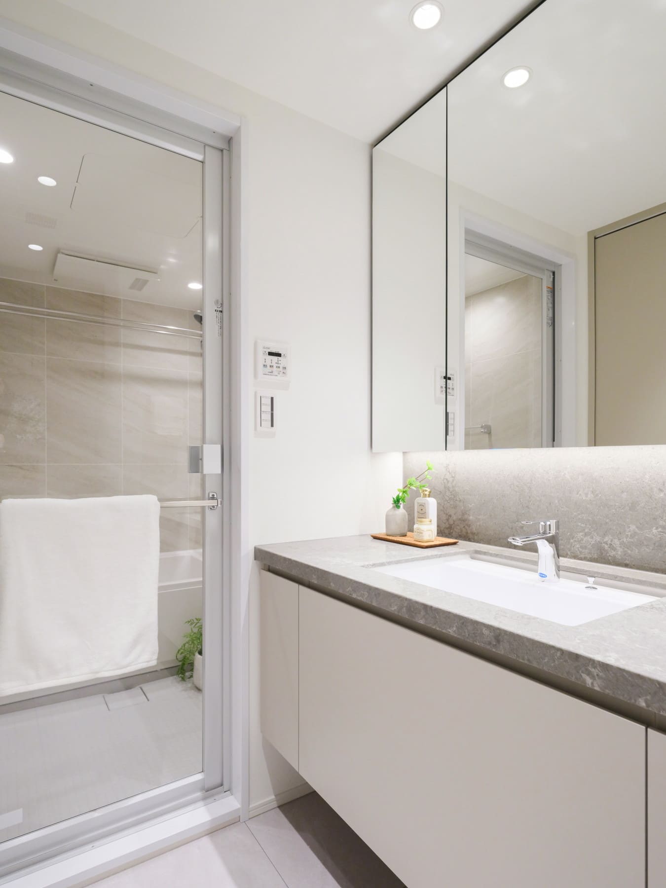 ミラー下の間接照明が手元をやさしく照らす洗面化粧台。石目調カウンターを採用し、ホテルライクな雰囲気が漂います。スペースにゆとりがあるため、化粧品やドライヤーの仮置きができ、忙しい朝の身支度も落ち着いて行うことができます。