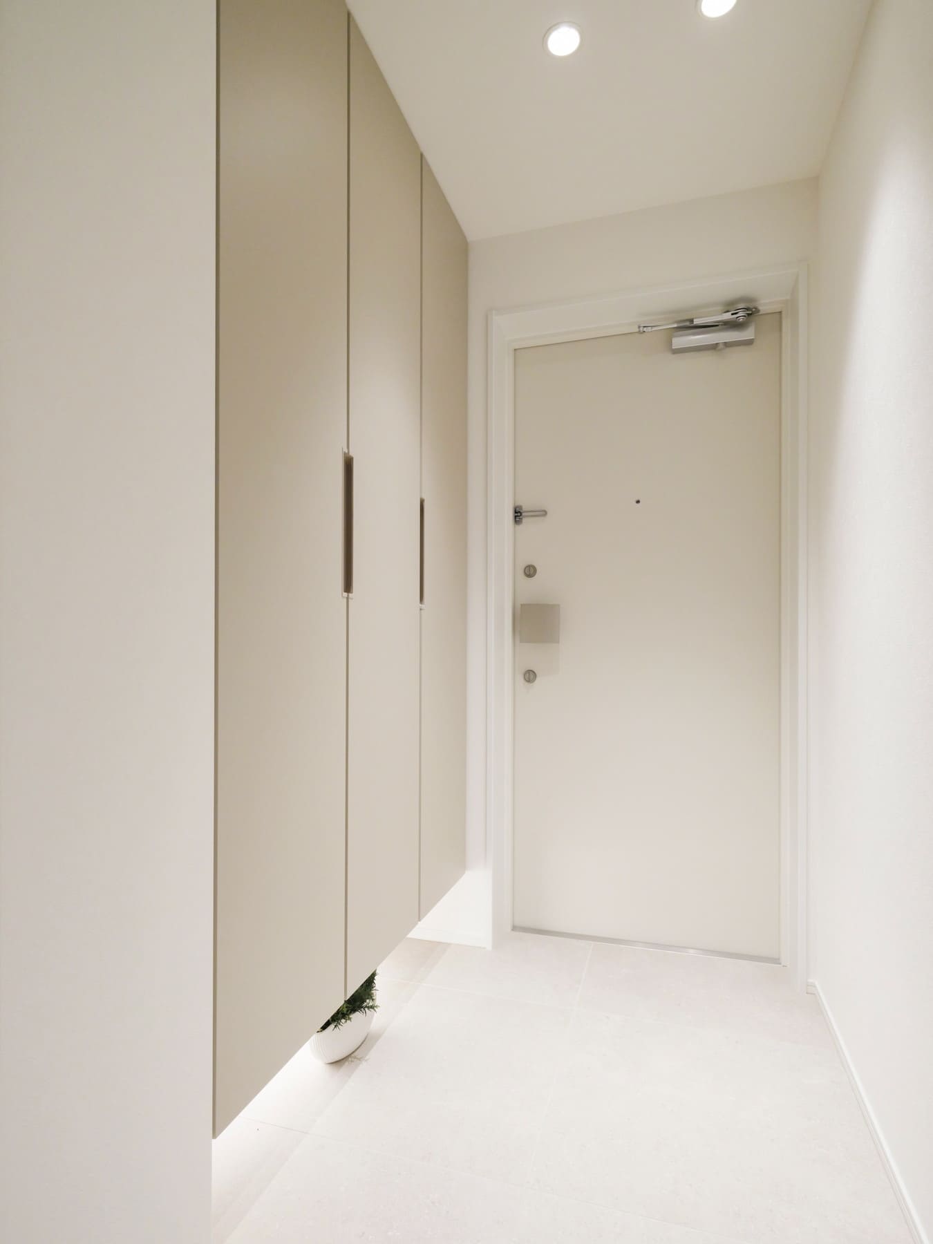 白基調で明るく清潔感のある玄関。フロートタイプのシューズボックスを採用し、フットライトが足元を心地よく包み込みます。廊下収納も充実していて、生活感を抑えたスタイリッシュな暮らしを叶えます。