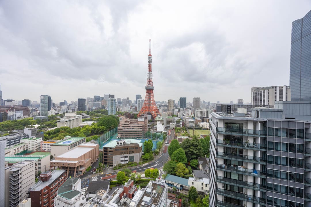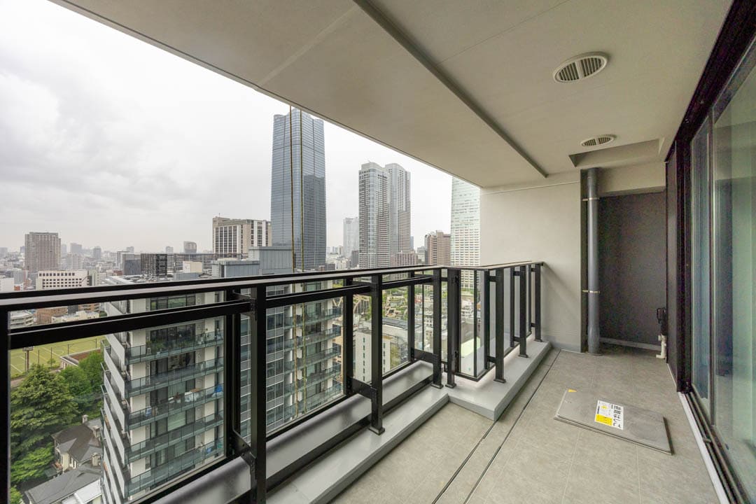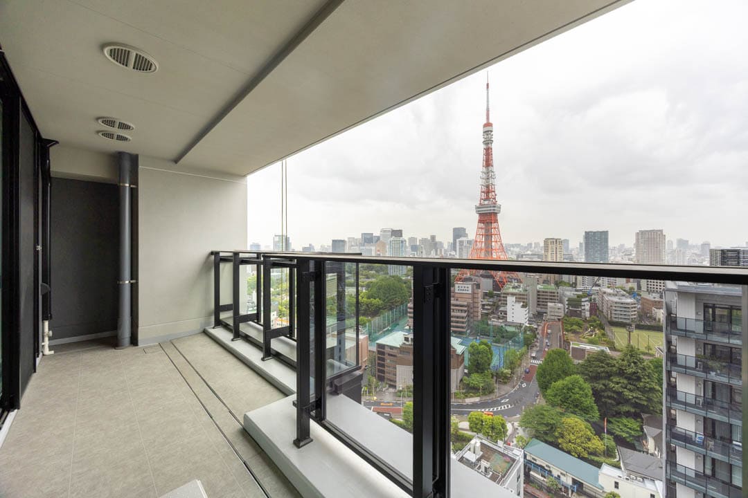 約9.98㎡のゆったりとしたバルコニーです。正面に堂々と構える東京タワーのビュー。遮るものが少なく、距離感もちょうど良いため、圧迫感なくランドマークを日常に取り込めます。室内から眺めるのとはまた違い、外気を感じながらダイレクトに都市の景色を楽しめるのはこのバルコニーならではです。
