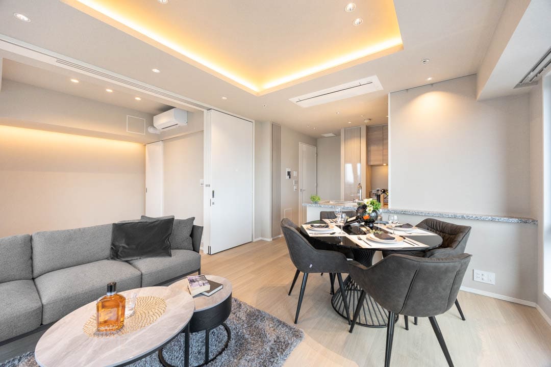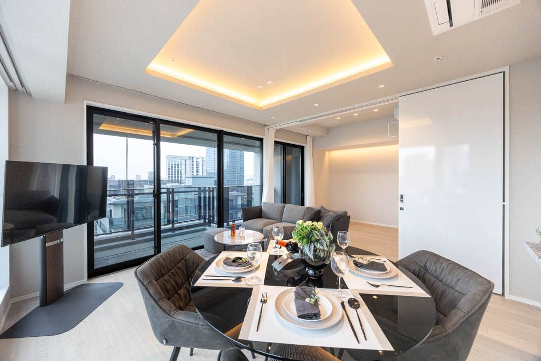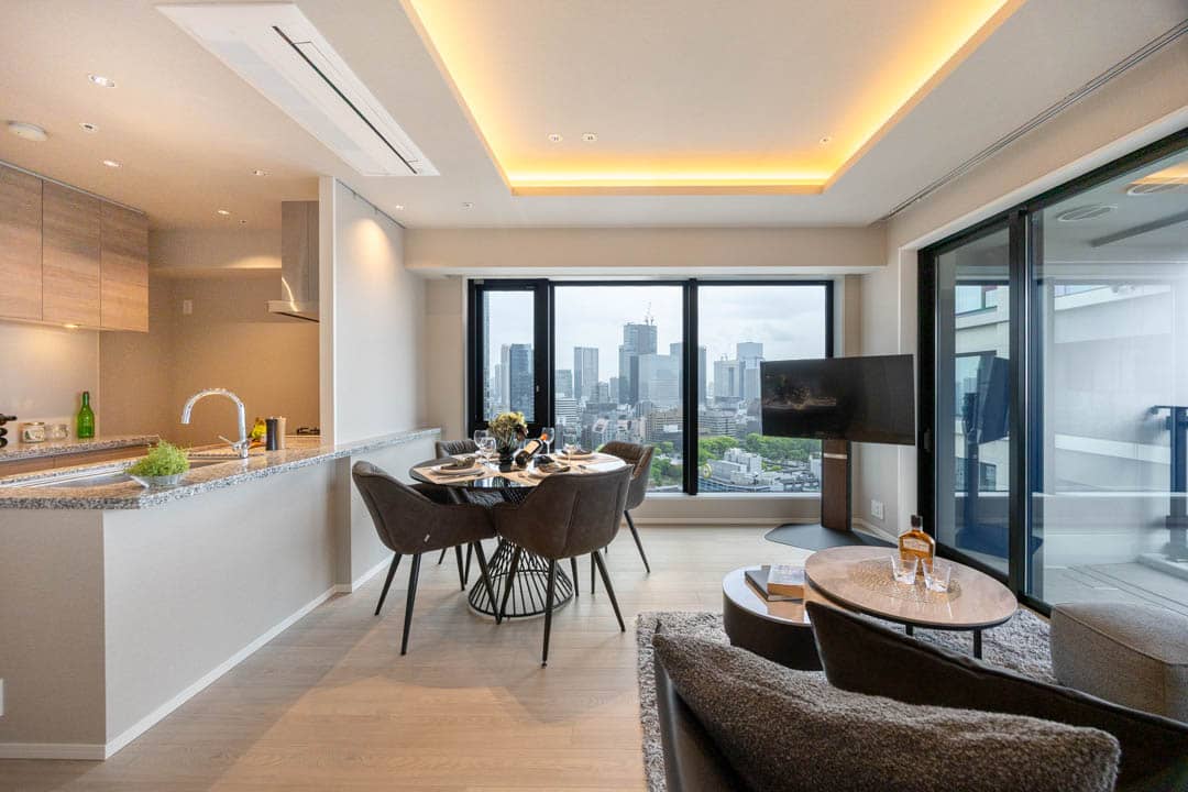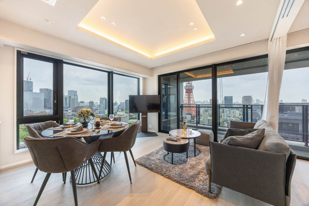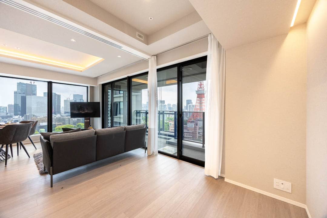 約14.3帖のリビングダイニングは、二面採光のため日当たり・通風が良好です。窓越しには東京タワーを望むことができ、リビングにいながら、まるで都心のランドマークを借景にしているような贅沢さがあります。日中は抜けのある都会的な景色、夜はライトアップによるドラマティックな表情へと変わり、時間帯によってまったく違う空間を楽しめるのがポイントです。