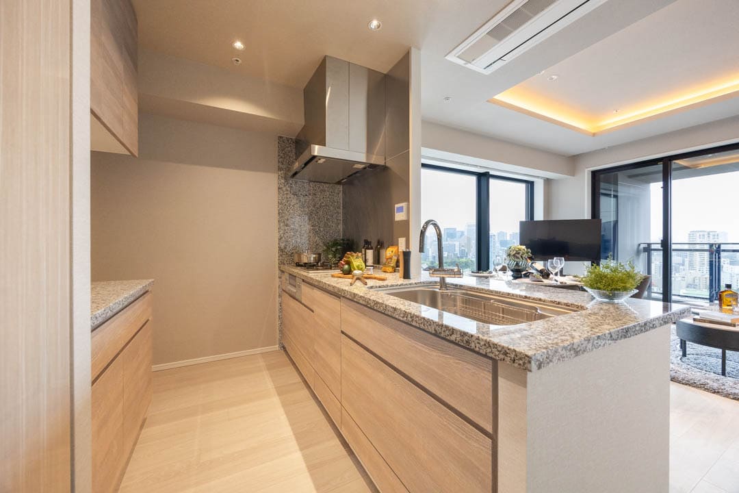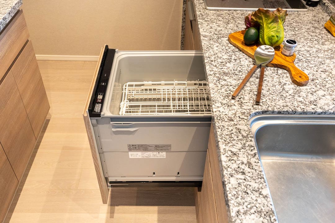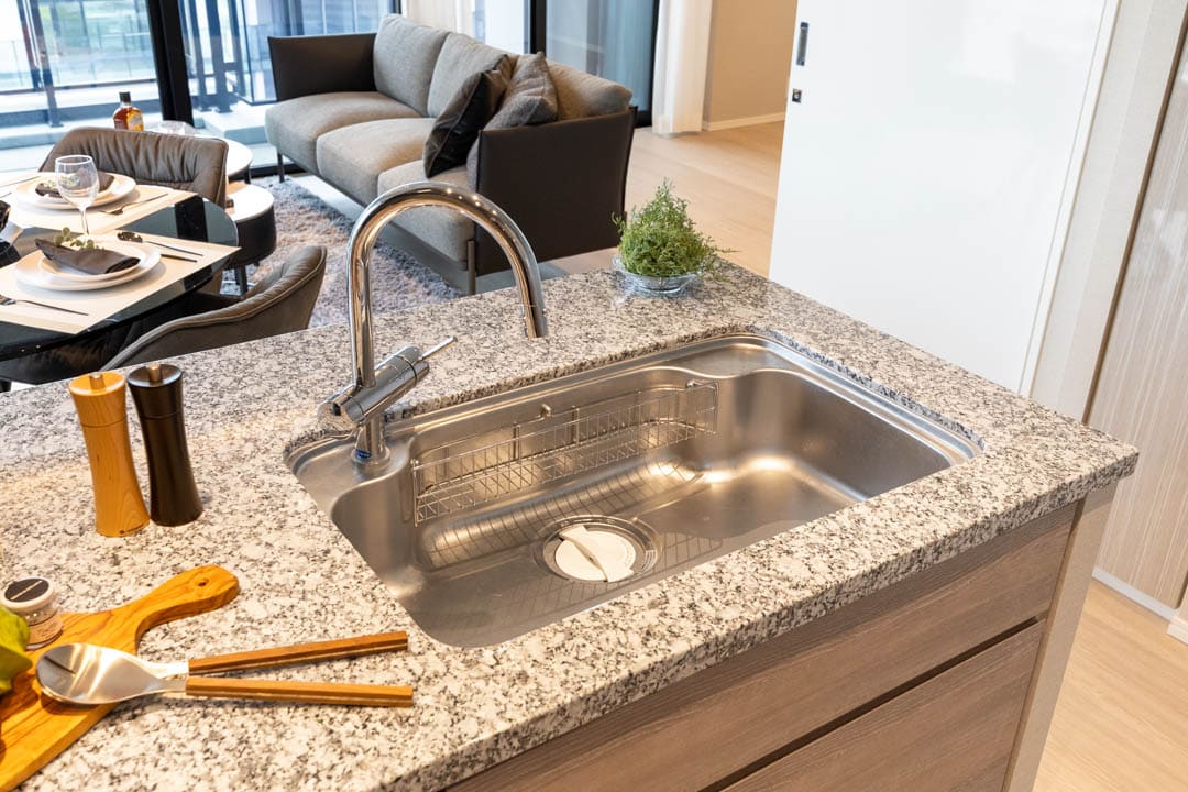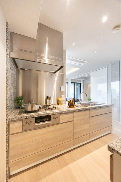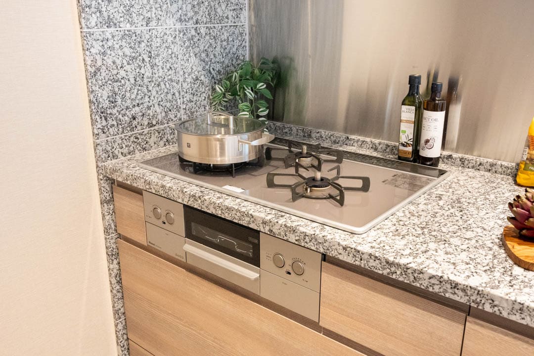 3口コンロ、グリル、ディスポーザー、食洗機付きと設備面も充実しています。シンクも広々としているので野菜などが洗いやすそうですよ。