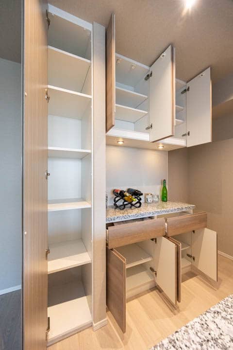 キッチンの背面側にはカップボードと棚が備え付けられています。調味料や食器などを収納できるだけでなく、電子レンジなどを置くこともできるので便利です。