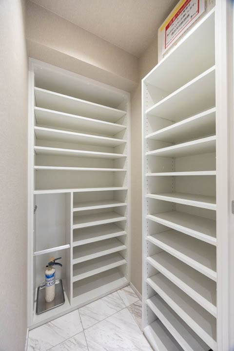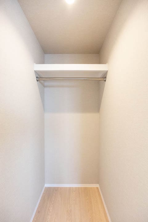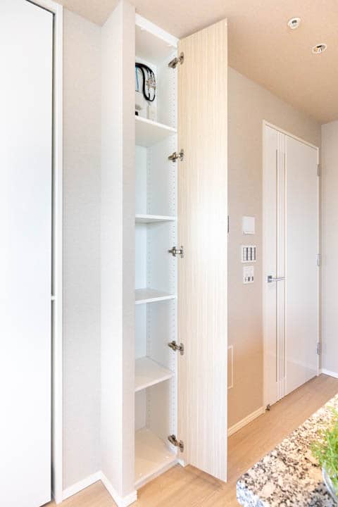 玄関入って右側にはシューズインクローゼットが造られています。中には可動棚が設置されているだけでなく、傘立てスペースもあって使い勝手が良好。照明には、人感センサーが付いているので、帰宅時に両手が塞がっていても安心です。消し忘れも防止できて節電にもなります。