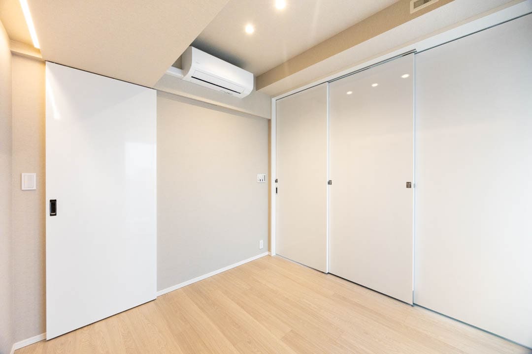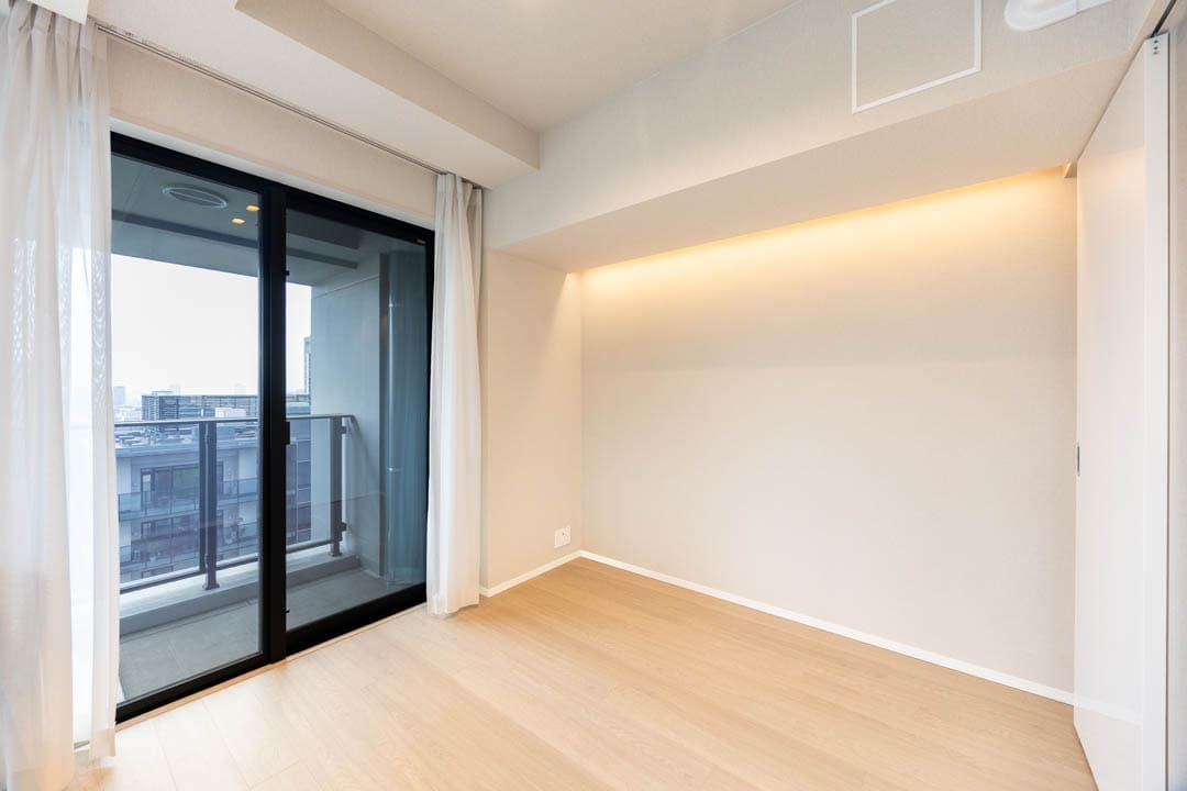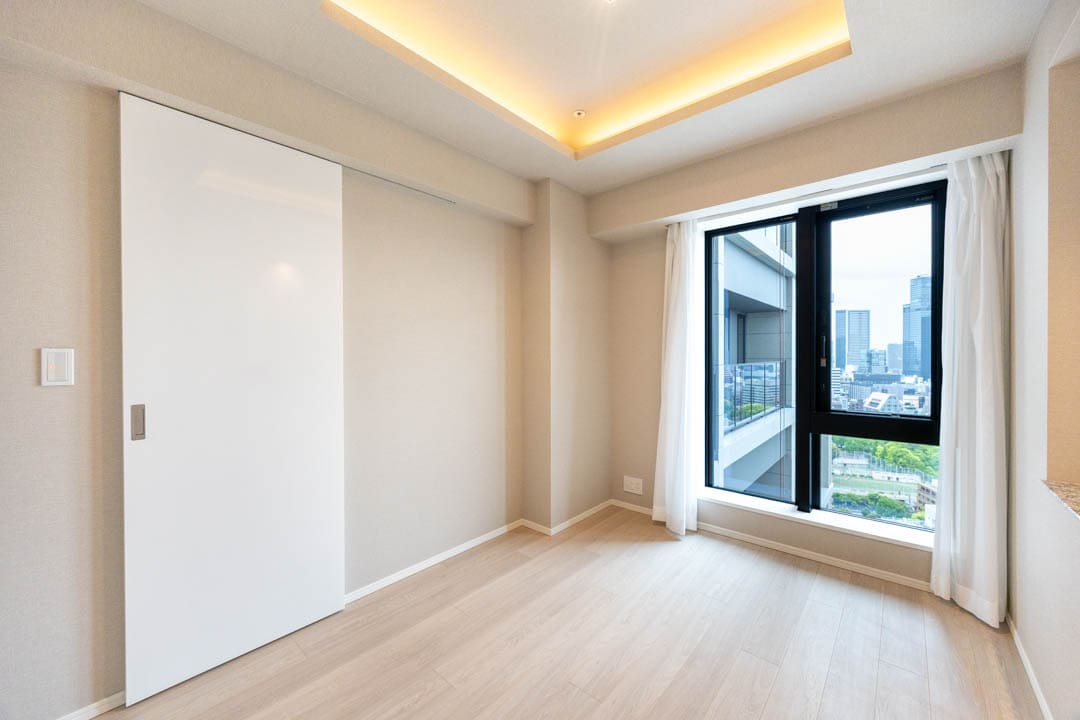 リビングダイニングキッチンに隣接している約5.0帖の寝室です。引戸を開閉することによって、空間をフレキシブルに使えて◎。窓からはバルコニー越しに東京タワーが望めます。また、こちらのお部屋にもウォークインクローゼットが付いており、大きめの荷物も収納することができますよ。