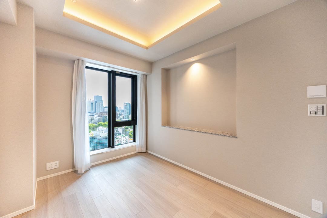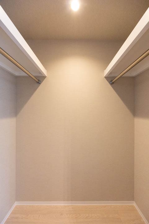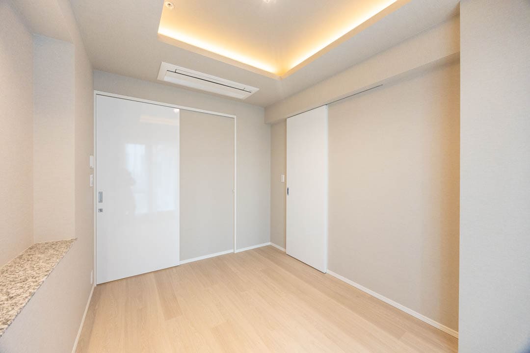 約6.0帖の主寝室はゆとりがある空間です。天井には間接照明、壁面にはカウンター、フロアには床暖房が設置されています。さらに、窓からの眺望も良好で居心地◎。また、奥行きがあるウォークインクローゼットがついているので、荷物もすっきりと収納できます。
