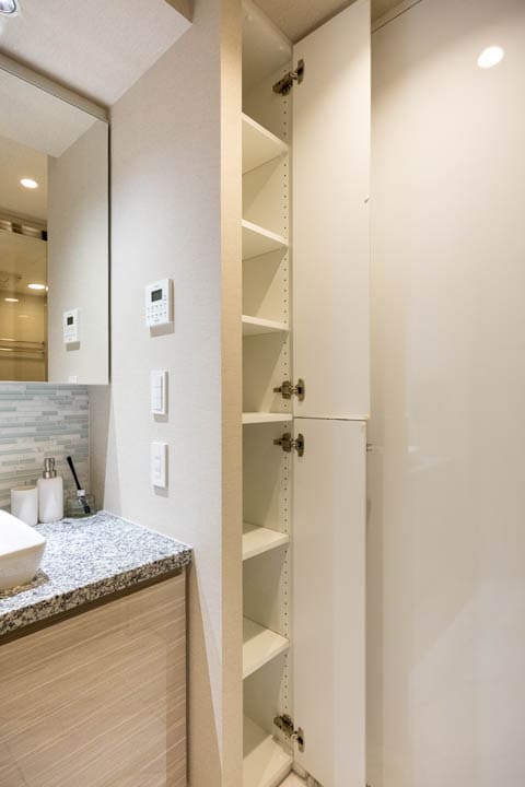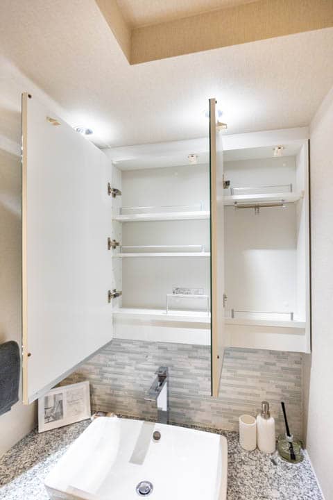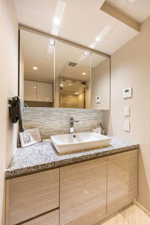 置き型式の洗面ボウルがおしゃれな化粧台です。三面鏡の中には化粧品などが収納できて、使い勝手も良好。横にリネン庫が造られているので、ごちゃごちゃしがちな洗面まわりをきちんと整頓できます。
