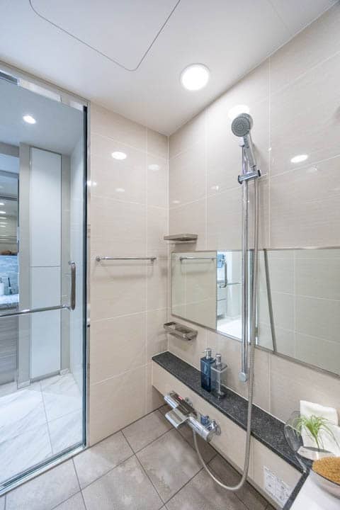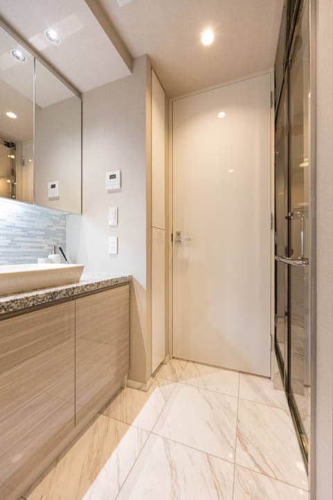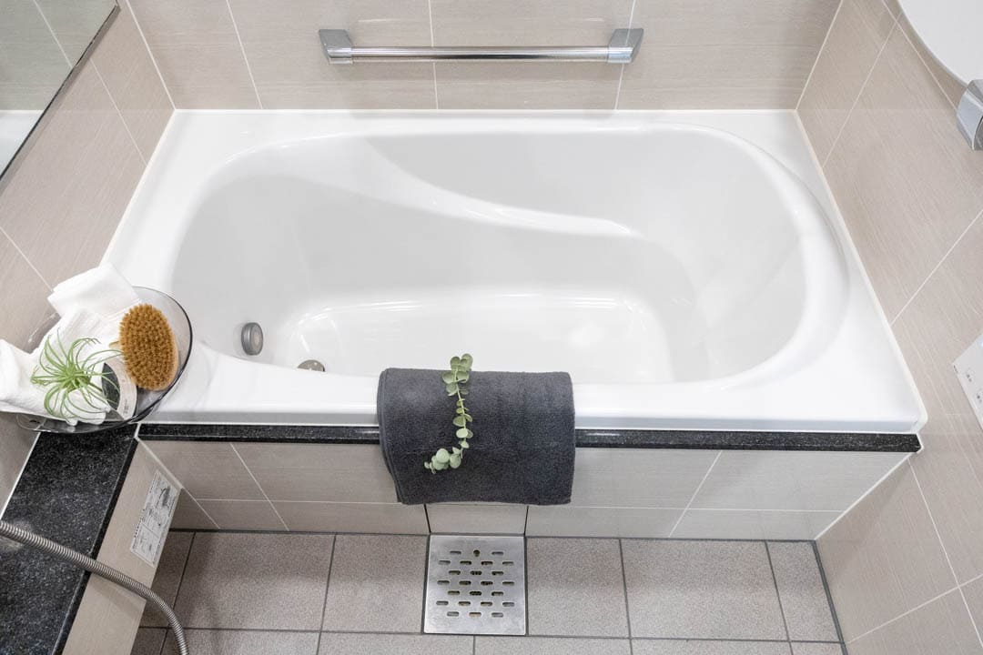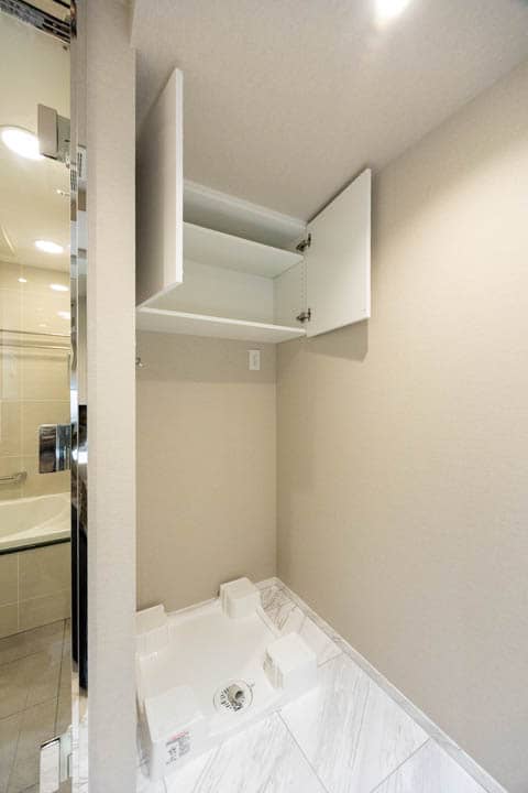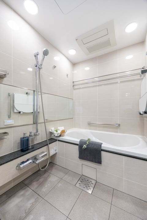 ベージュトーンで落ち着いた雰囲気が漂うバスルームです。お風呂にゆっくり浸かるのが好きという方に嬉しい追い焚き機能を搭載。家族の入浴時間がずれてしまっても安心です。また、浴室乾燥機には暖房・乾燥・換気・涼風の機能がついており、一年中快適に過ごすことができます。