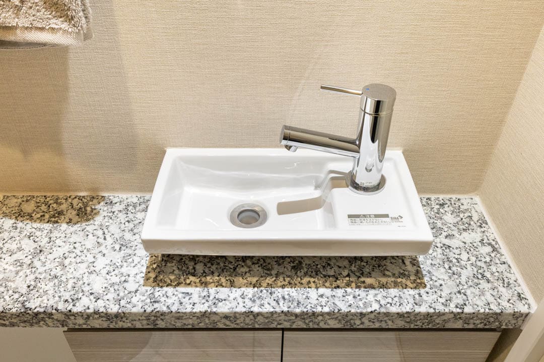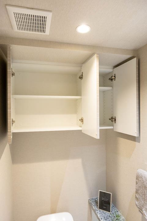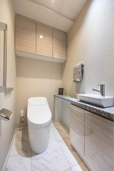 ウォシュレット一体型のトイレです。タンクレスタイプなのですっきりとした印象に。また、別途で手洗い器が造られているので、すぐに手を洗うことができて衛生的です。上部には吊戸棚が設置されていて、収納スペースもありますよ。カウンタースペースにはアロマなどを置いても◎。