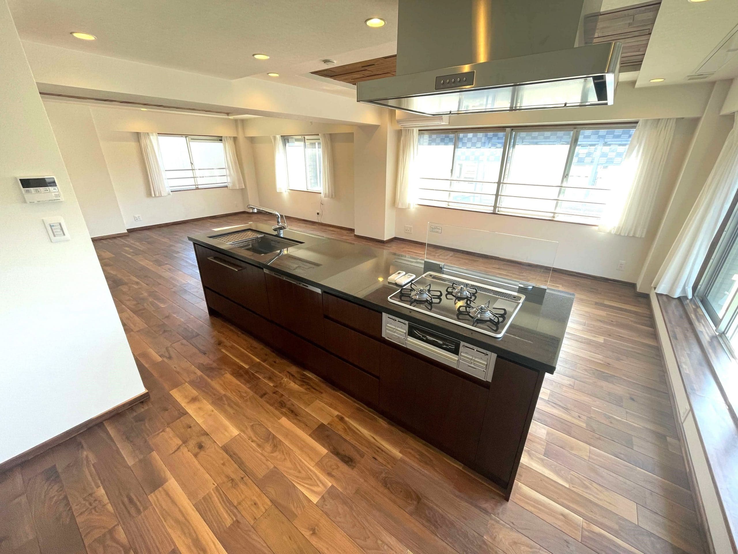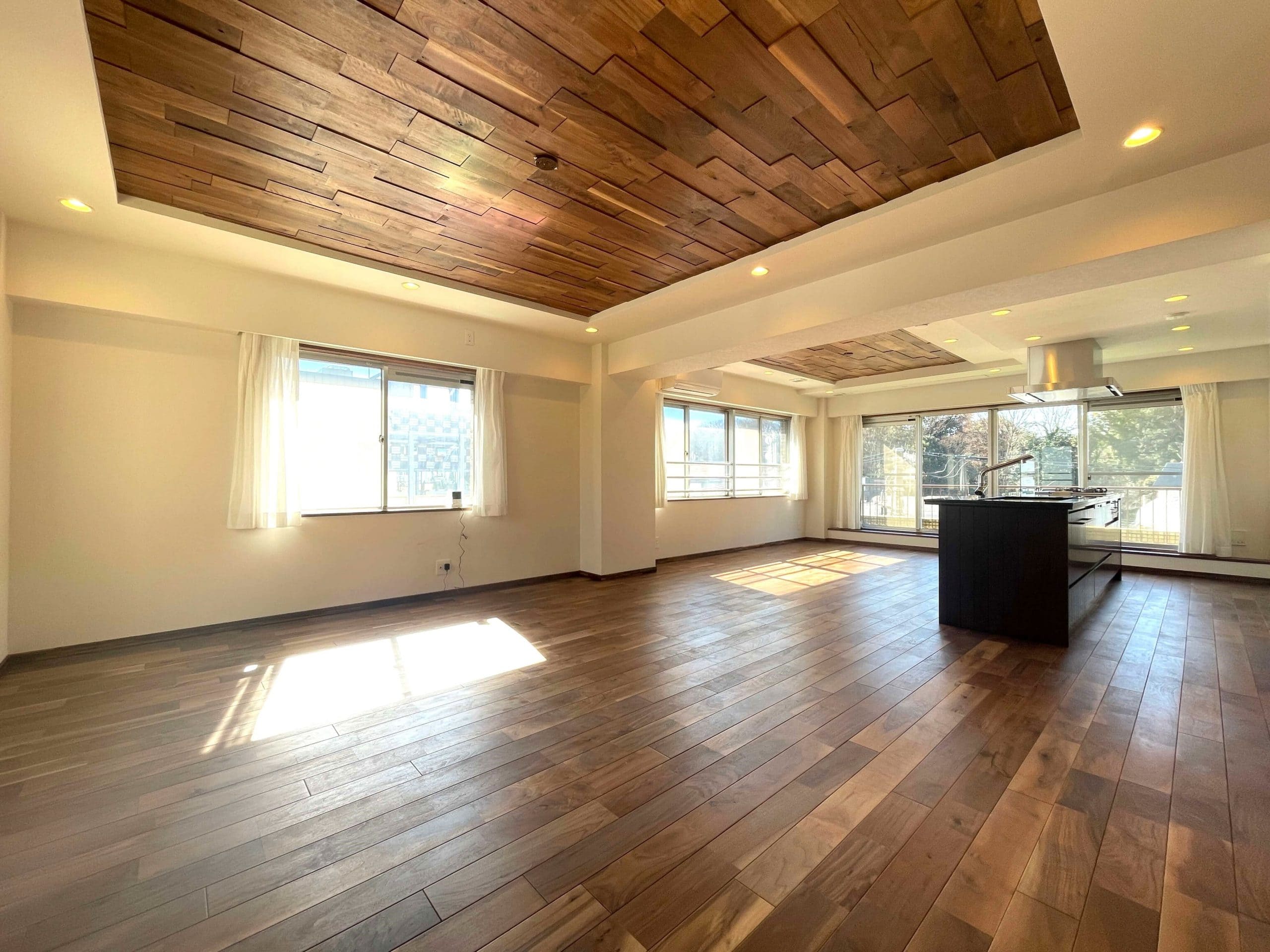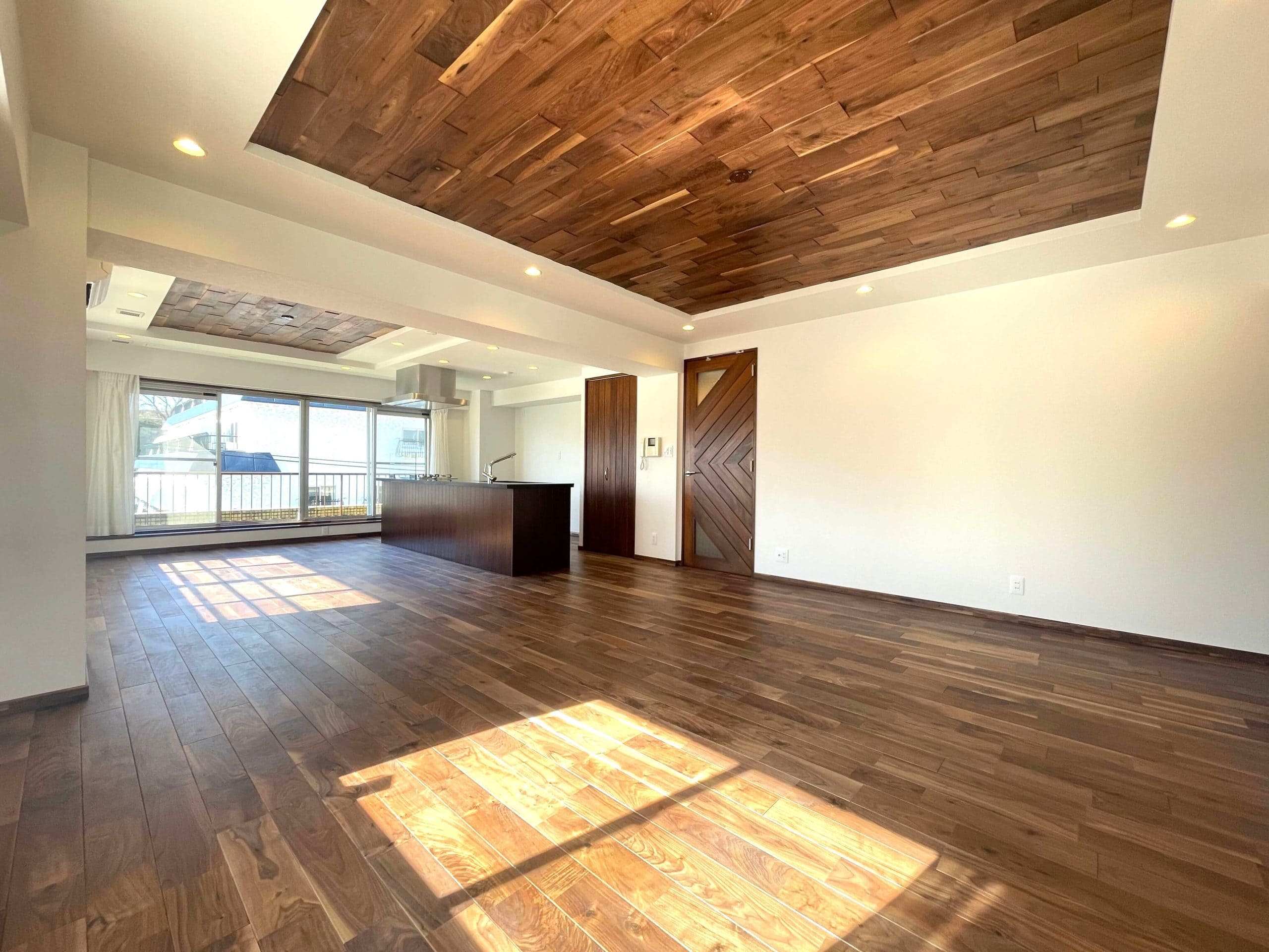 約28.3帖の広々としたリビングダイニングキッチンです。木目柄が特徴的な空間で、ナチュラルな雰囲気。天然無垢のウォルナット材がフローリングには採用されており、耐久性があって、使い込むほどに味わいが出てくるのも、今後の楽しみになります。また、二面採光のため日当たり・通風が良好です。