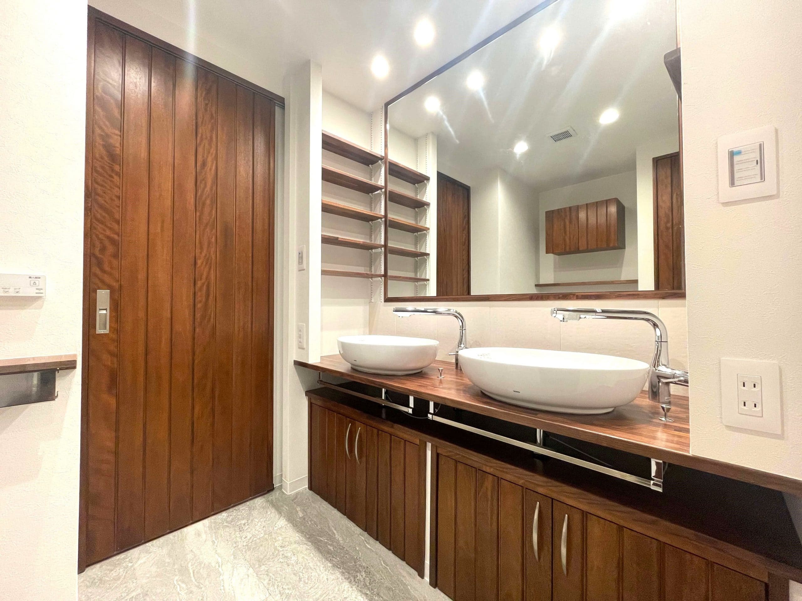ホテルライクな2ボウル洗面の化粧台です。忙しい朝でも並んで身支度ができるのも嬉しいですね。可動棚や下部収納もあって便利。