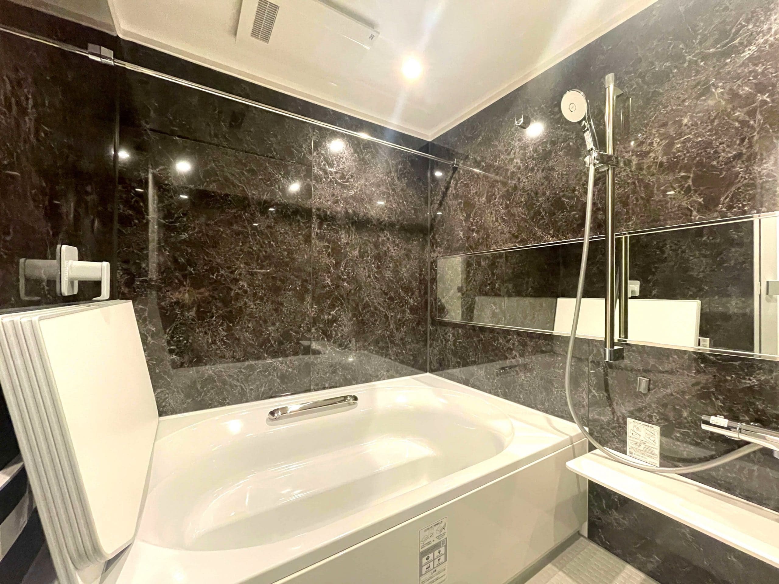 ストーン調の壁パネルで重厚感のあるバスルームです。1620サイズのため、ゆったりと入浴することができそうですよ。また、雨の日の洗濯物にも便利な浴室乾燥機も搭載されています。