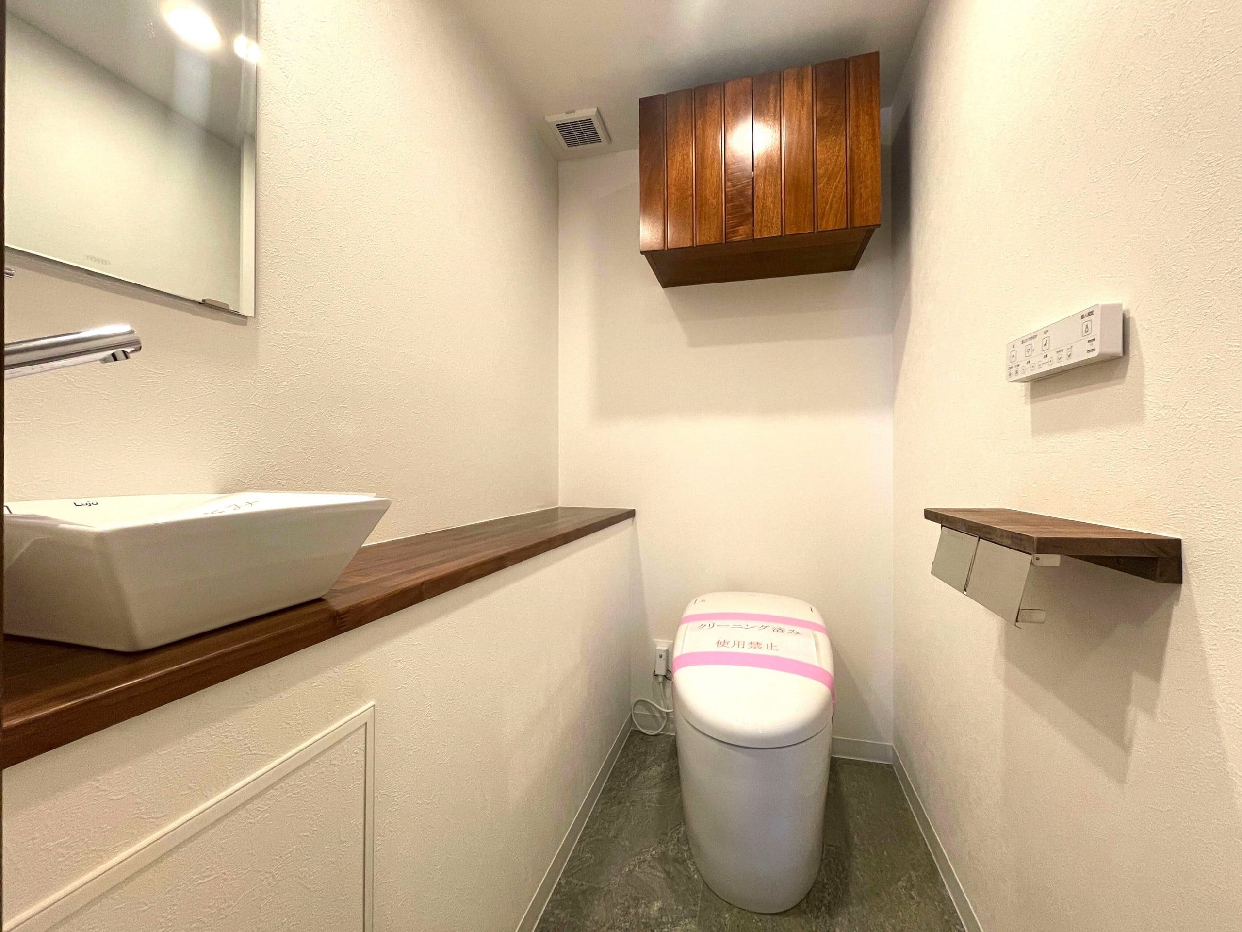 ウォシュレット一体型のトイレです。タンクレスタイプなのですっきりとした印象に。また、別途で手洗い器が造られているので、すぐに手を洗うことができて衛生的です。上部には吊戸棚が設置されていて、収納スペースもありますよ。カウンタースペースにはアロマなどを置いても◎。また、洗面室にもトイレがあるので、使い分けの可能です。