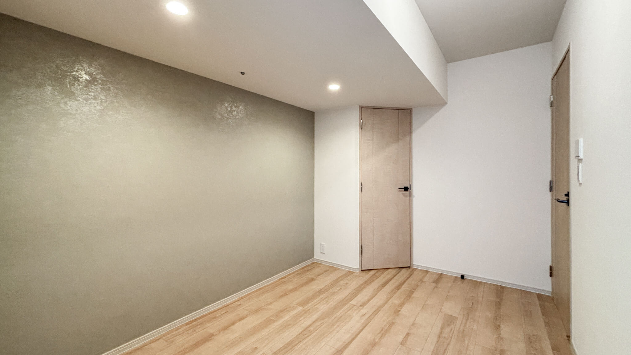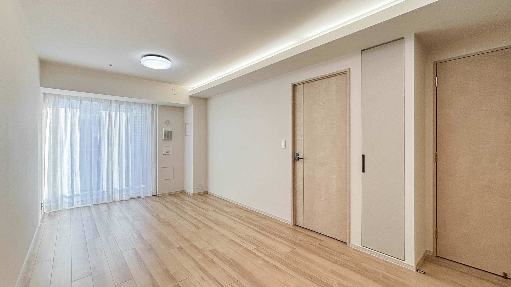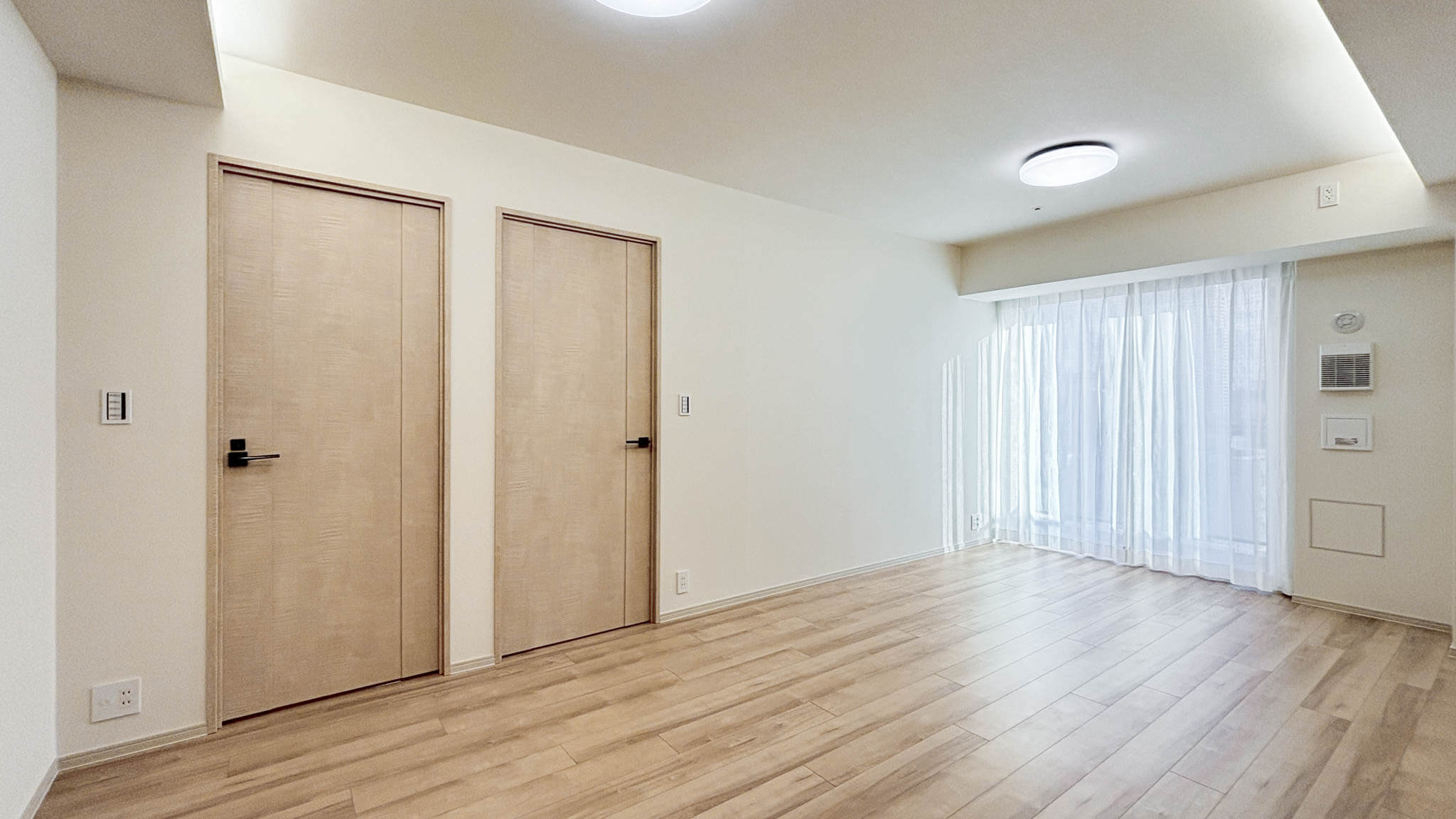 約5.0帖の洋室2。こちらもリビングから直接出入り動線で、家族とのコミュニケーションが取りやすくなっています。南向きで窓はバルコニーに面しています。クローゼットも付いています。