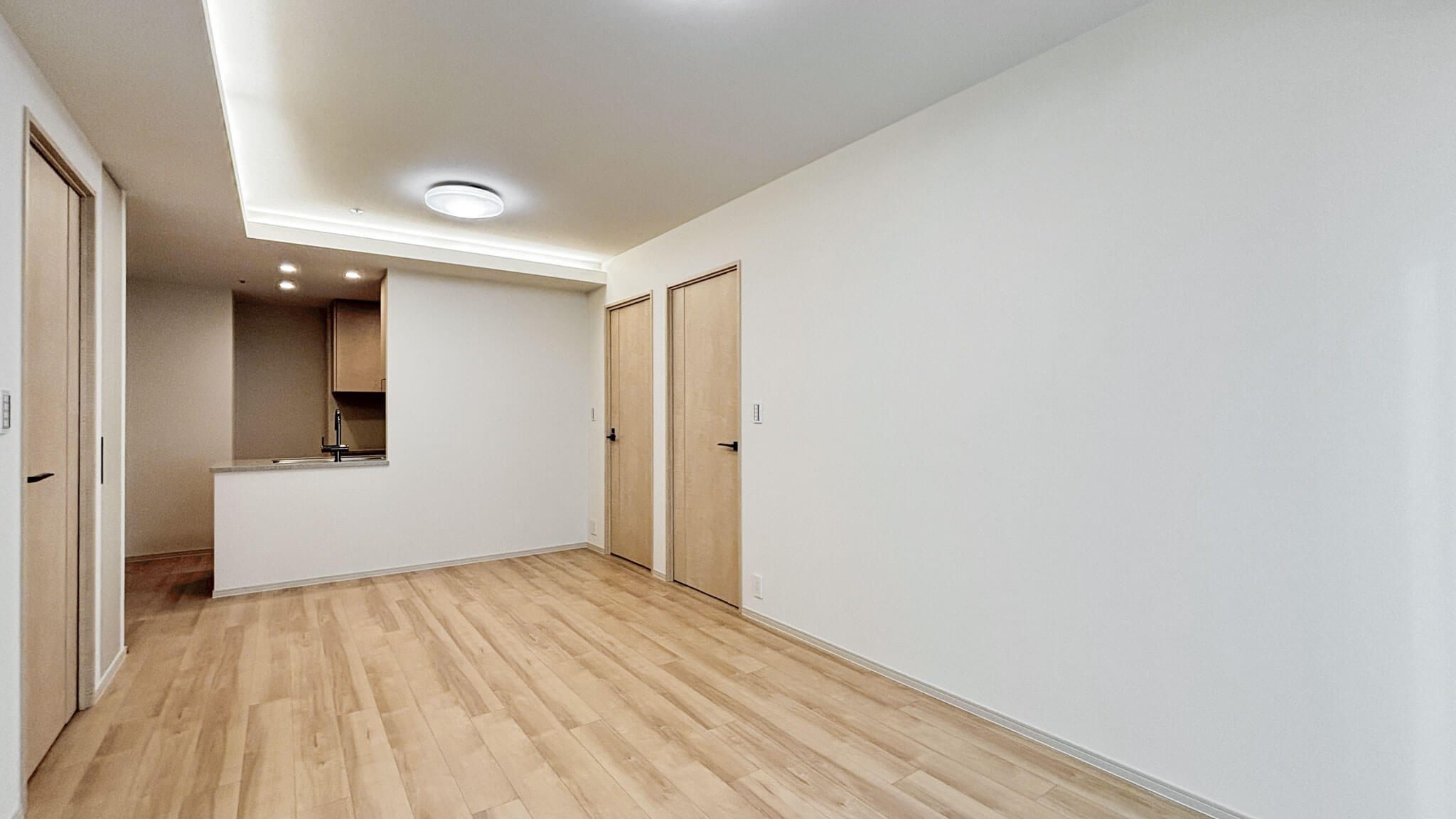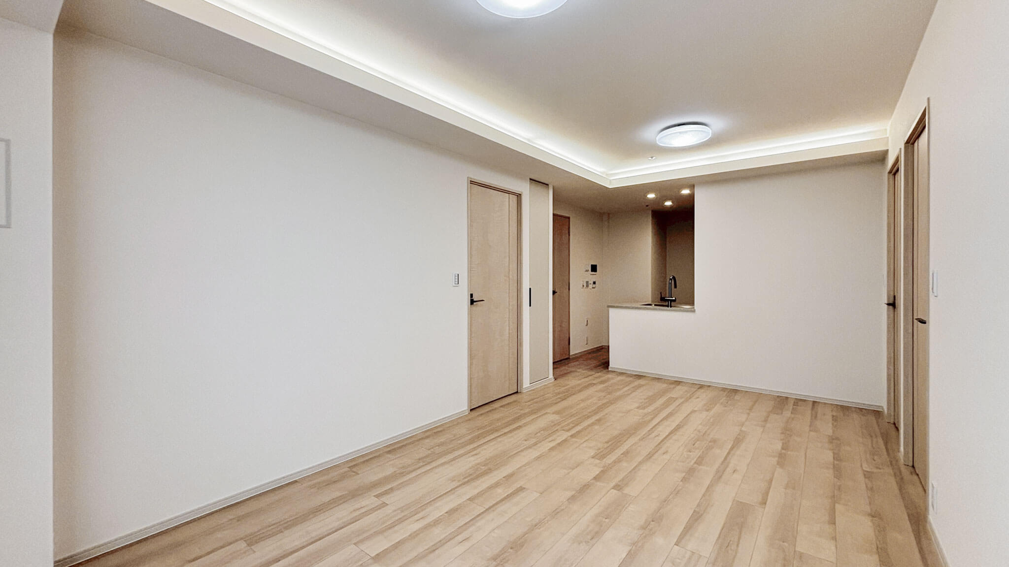 約11.8帖のリビングダイニング。折り上げ天井には間接照明が施されていて、空間をやさしい光で包み込みます。南向きで自然な光を取り込む明るいお部屋。カーテンを開ければ室内からでも開放的な景色が望めます。また、各洋室と洗面室はリビングから直接出入り可能。家族とのコミュニケーションが取りやすい動線です。