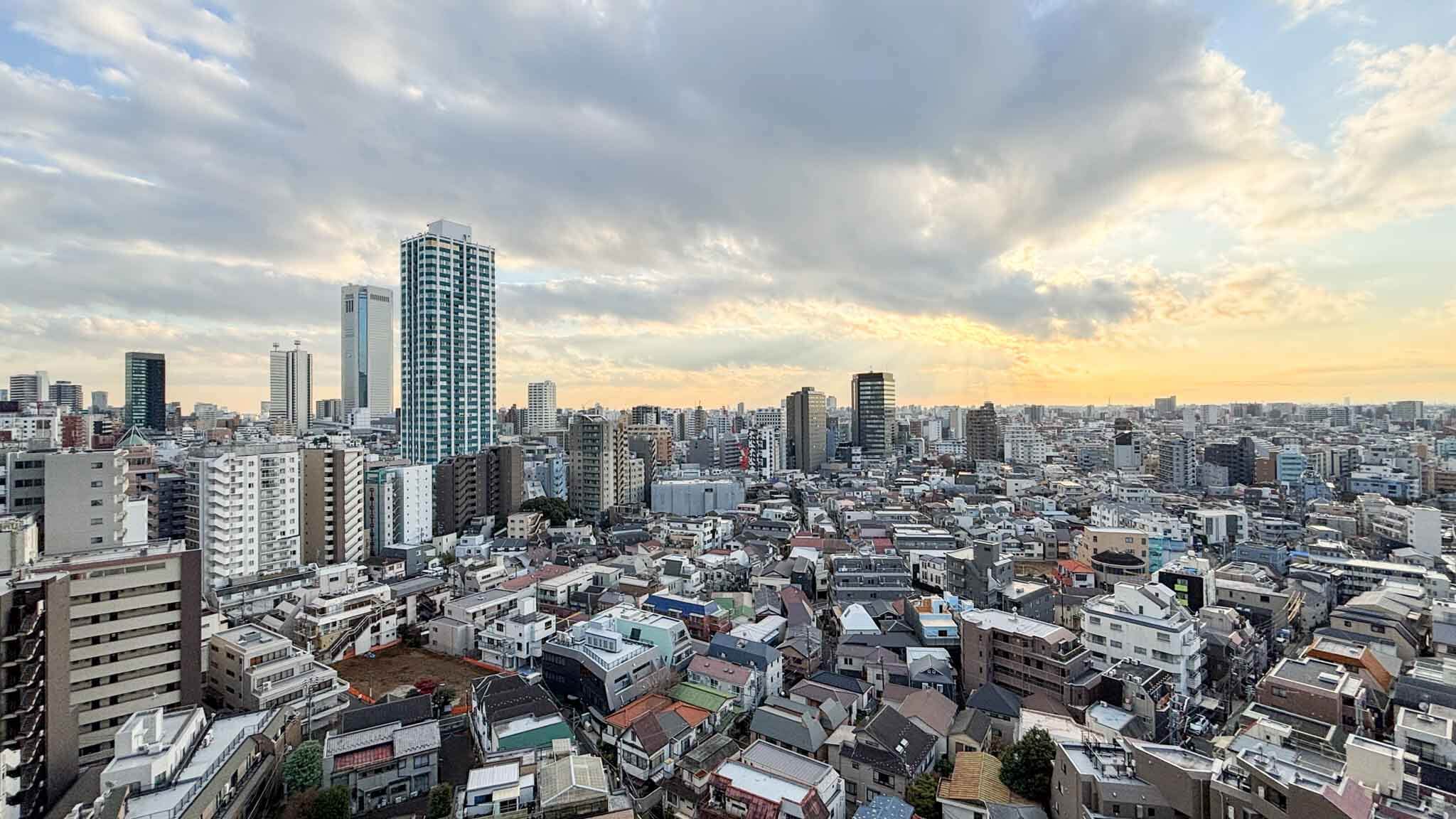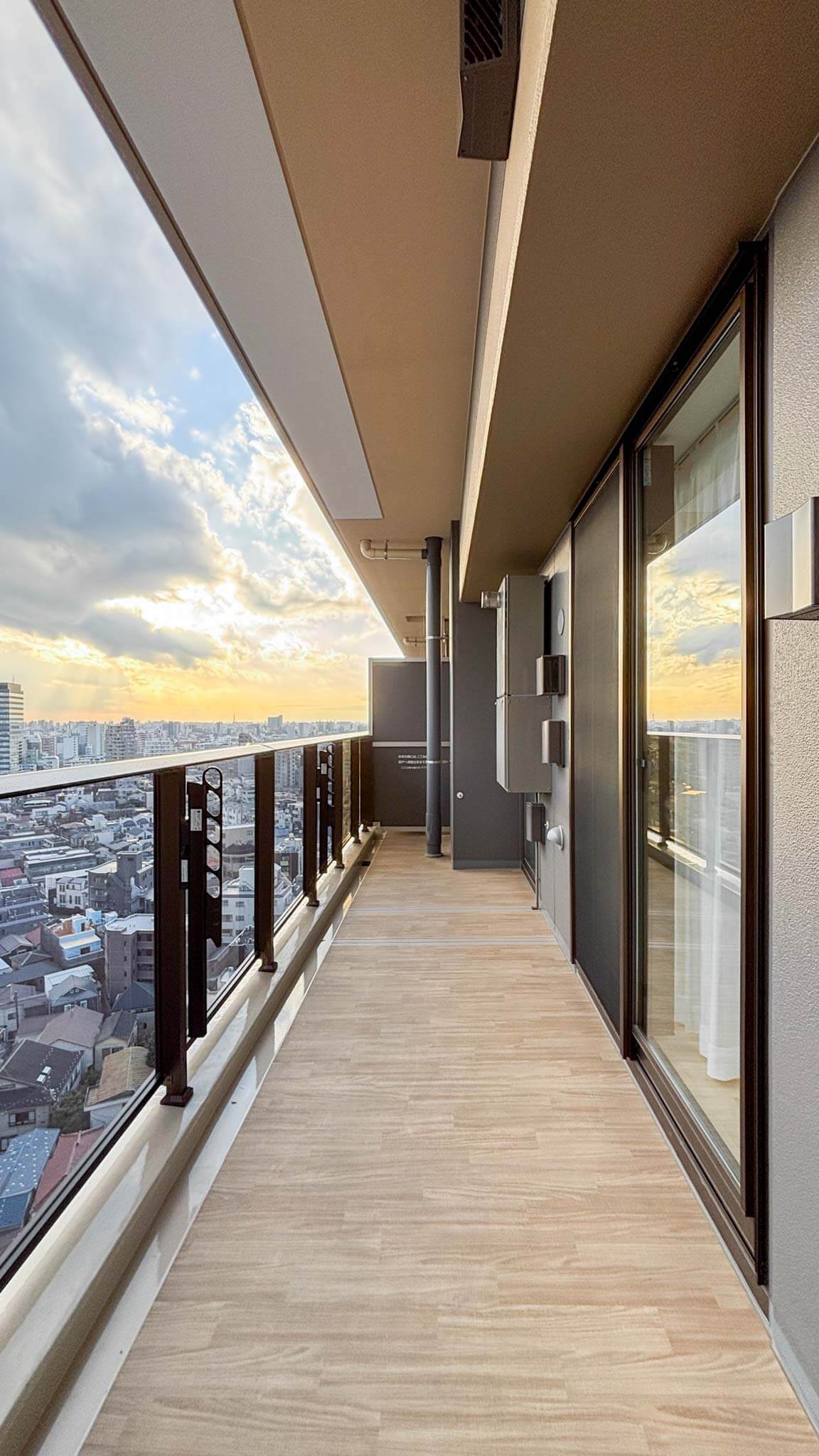 全居室に面したワイドスパンバルコニー。約12.07㎡ほどの広さで、南向きで陽当りも良好です。手すりが透明になっていて開放感もよりUP。床材もウッド調で見た目の印象も◎です。15階部につき見晴らしが良く、新宿エリアのビル群が望めます。夜には煌びやかな夜景も楽しめそうですね。