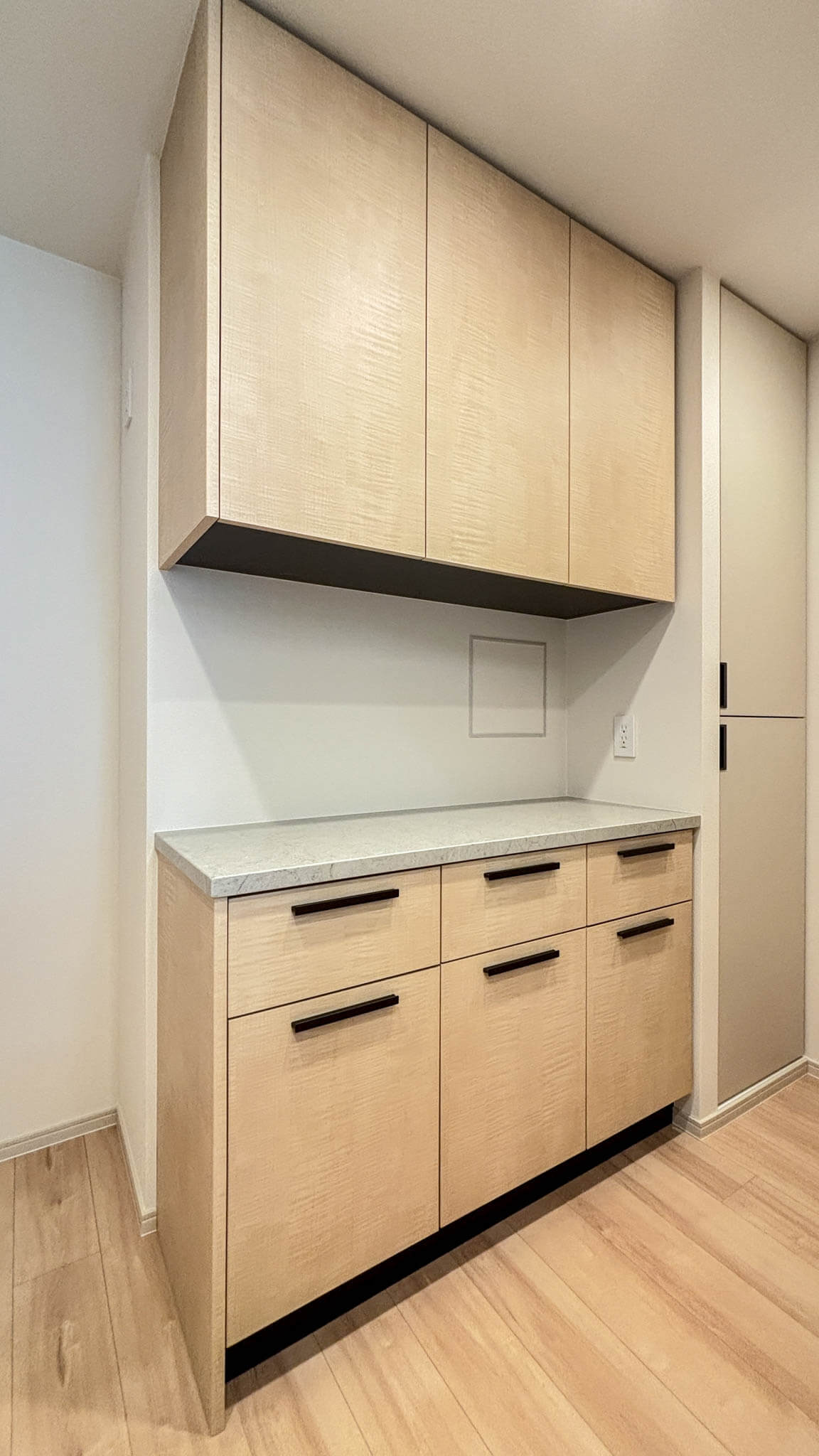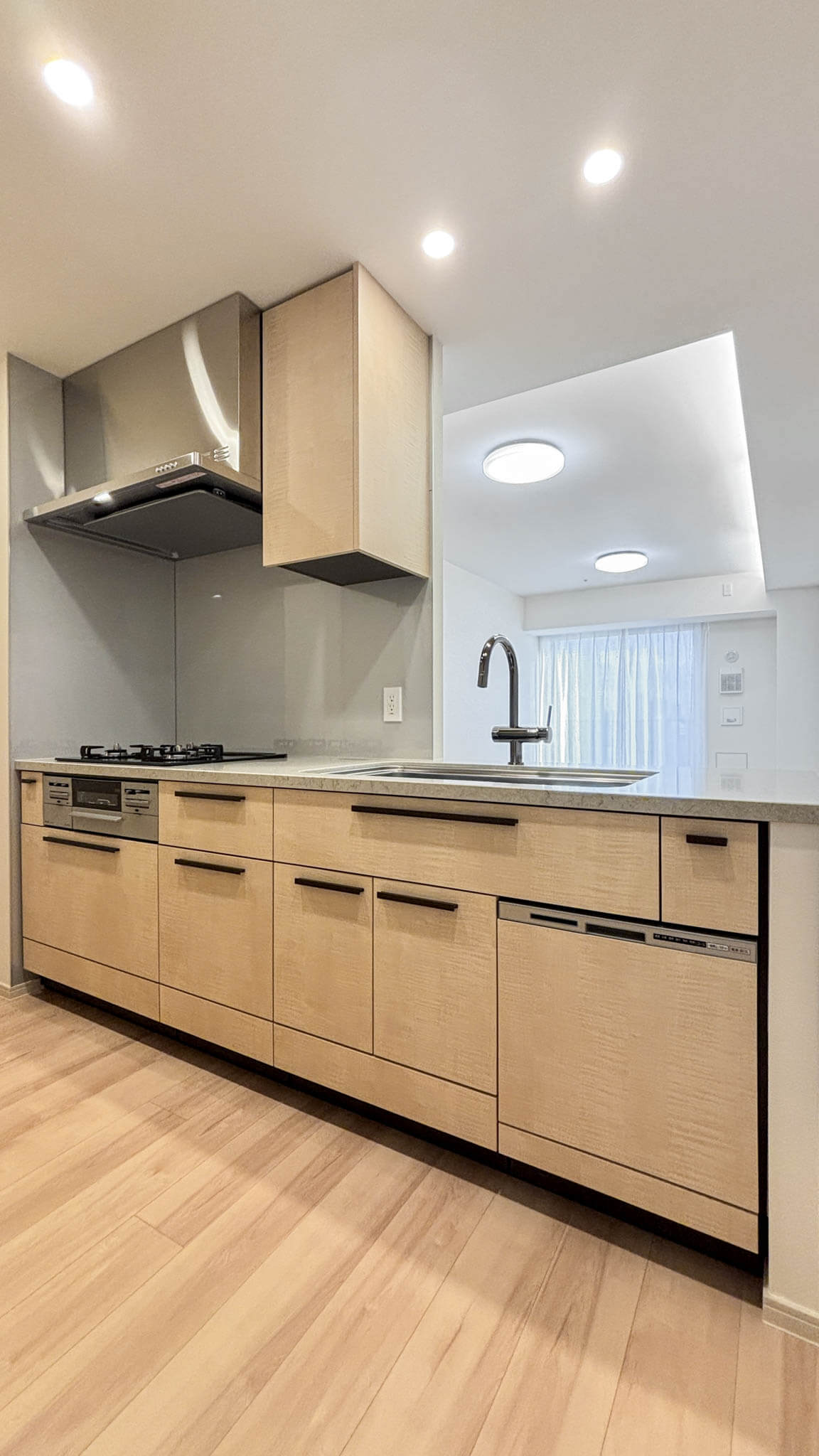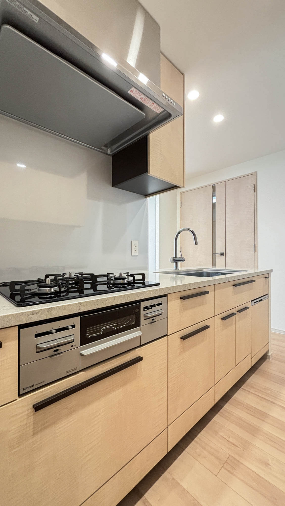 約2.8帖のキッチンスペース。家族やゲストとコミュニケーションが取りやすいセミオープン型のシステムキッチンです。料理が捗る3口ガスコンロ、家事の時短に心強い食洗機付き。カップボードも設置されていて、収納スペースもしっかりと確保されています。