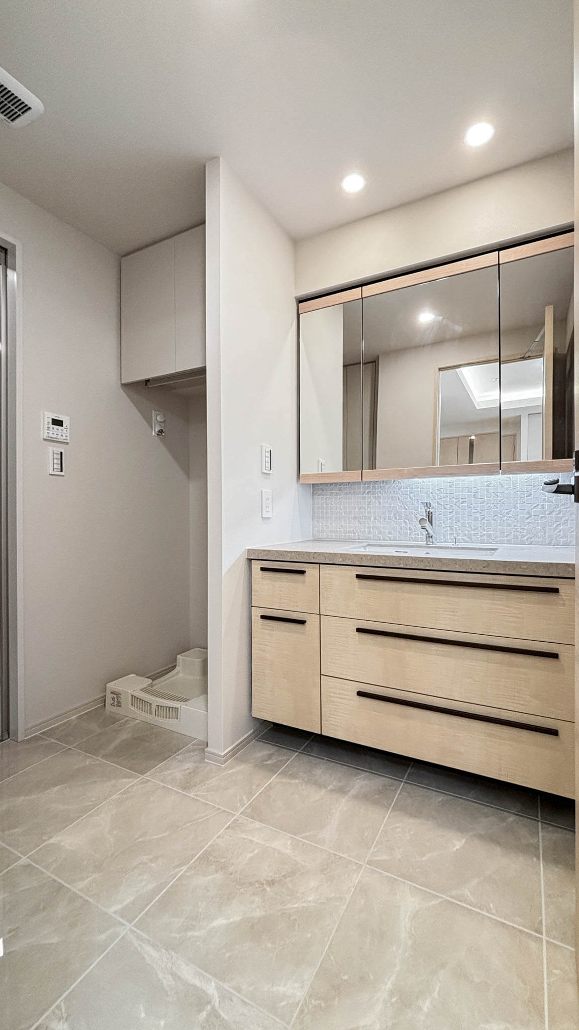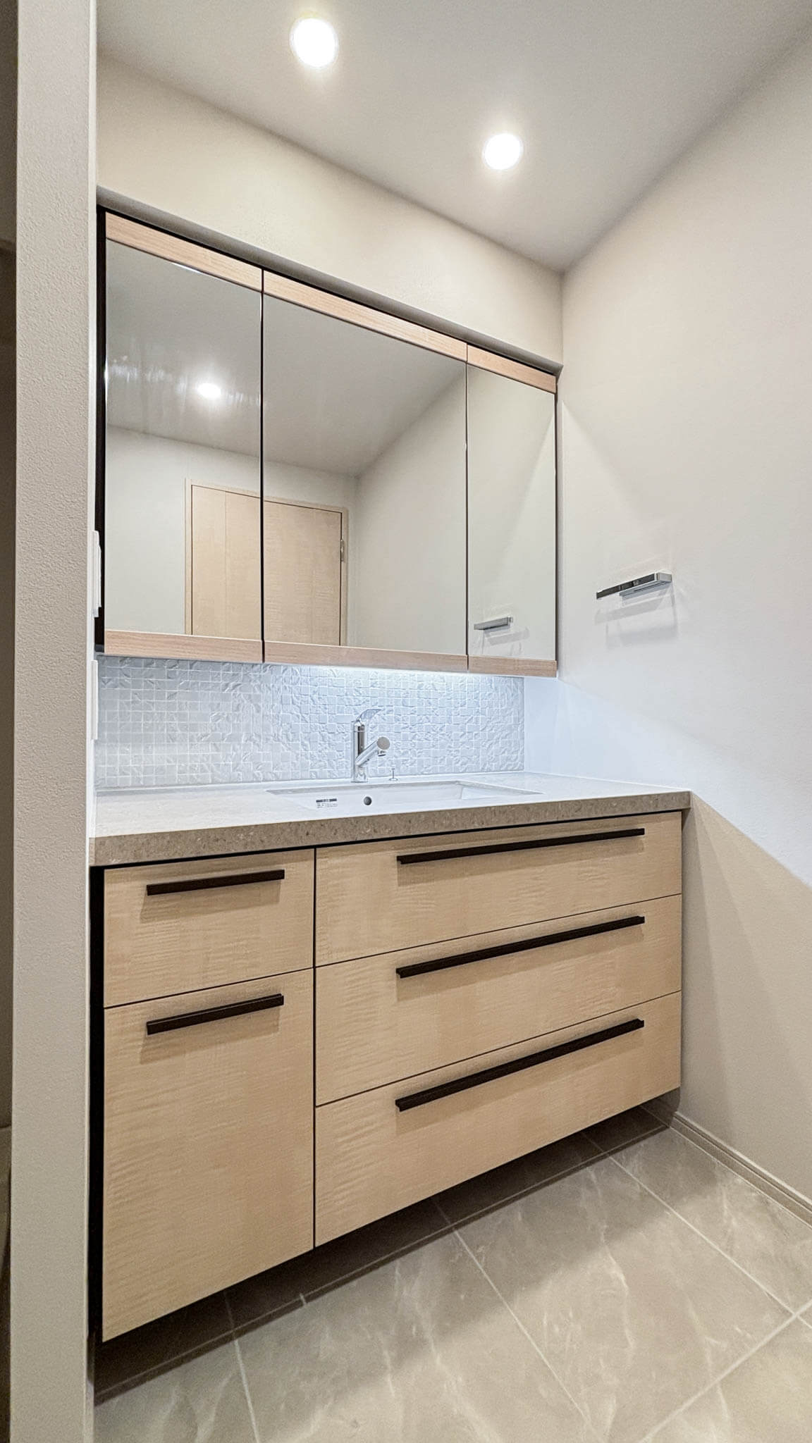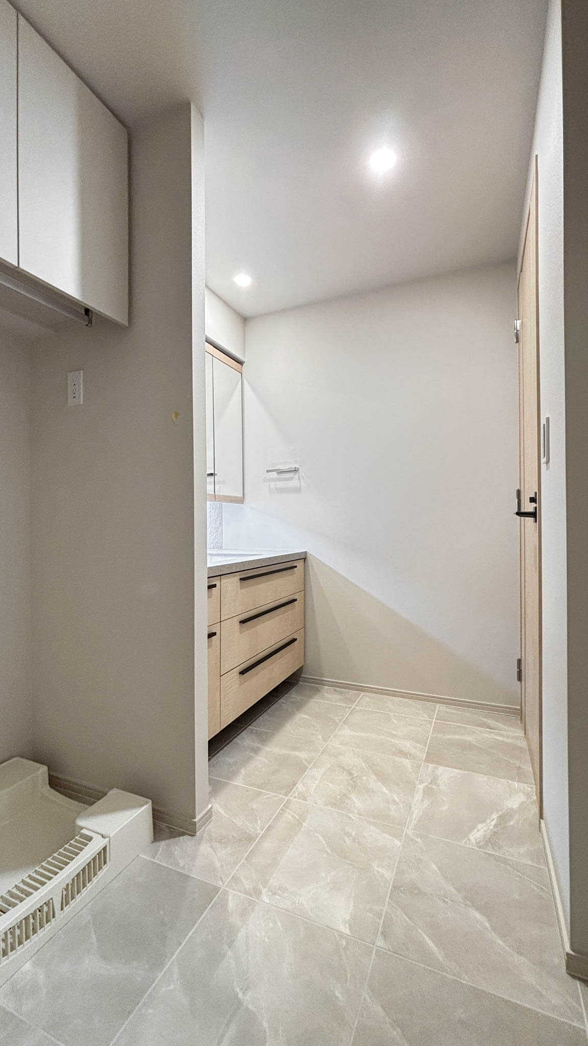 リビングから直接出入りできる洗面室。洗面化粧台は小物類がすっきり整頓できるミラーボックスや、モノの出し入れがしやすい引き出し式のキャビネット付きで使い勝手の良さもポイントです。洗濯機置場の上部にも収納スペースが備わっています。