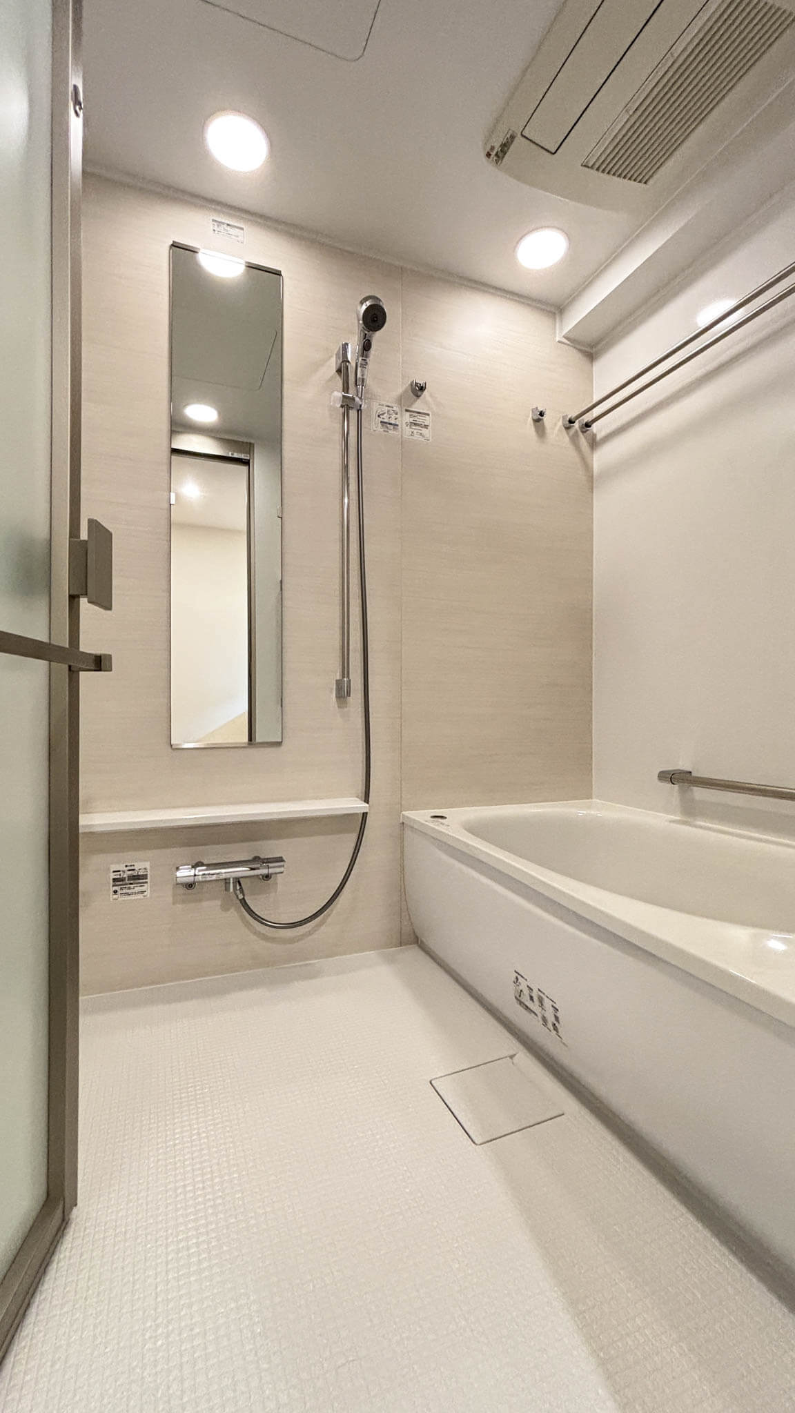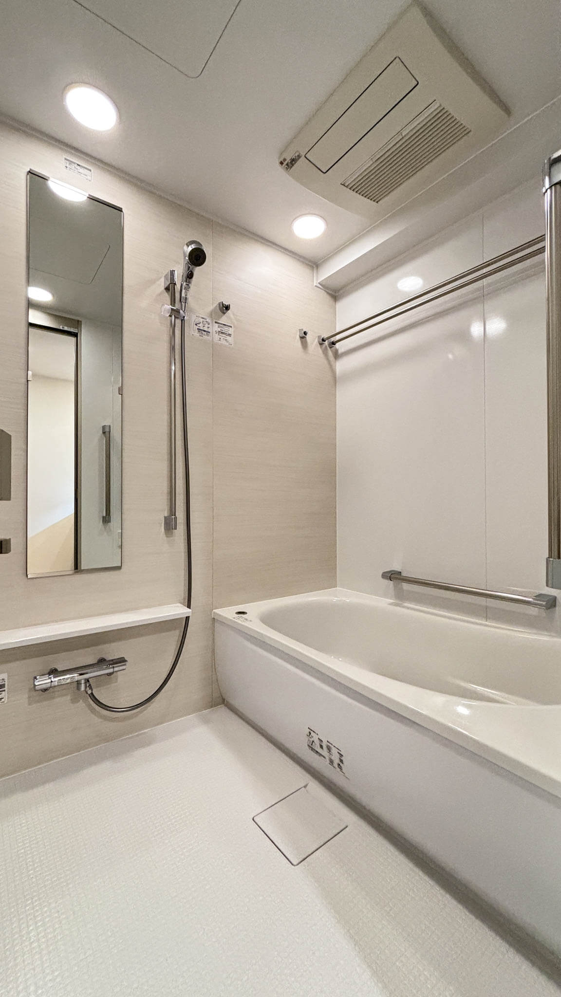 1418サイズのバスルーム。追い炊き機能の他、浴室換気乾燥機とランドリーパイプ2本付きで雨の日や冬場の洗濯にも困りません。