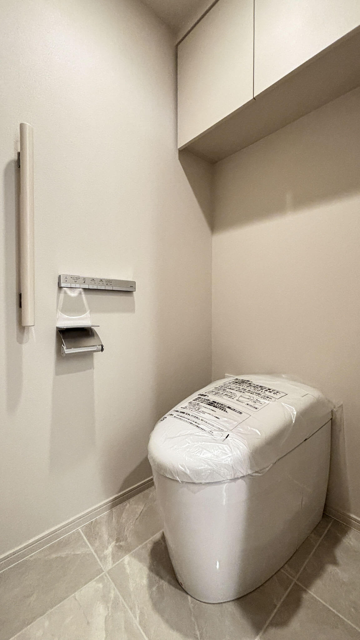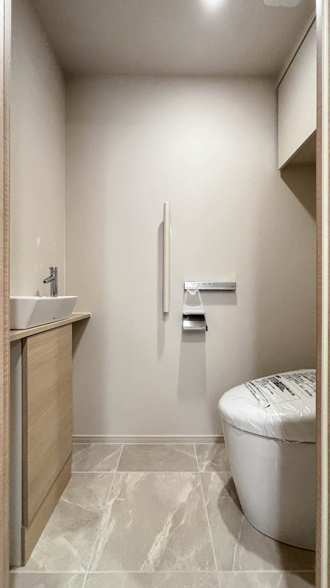 廊下に面したレストルーム。空間がすっきり見えるタンクレストイレです。独立型の手洗い器、ウォシュレット、収納スペースも備わっています。