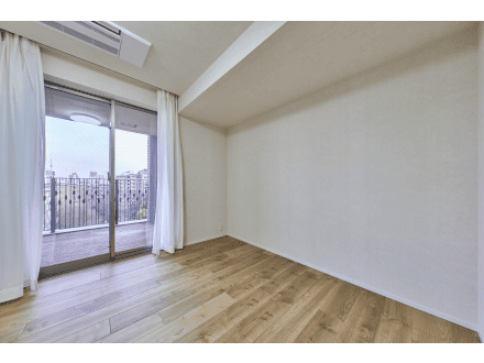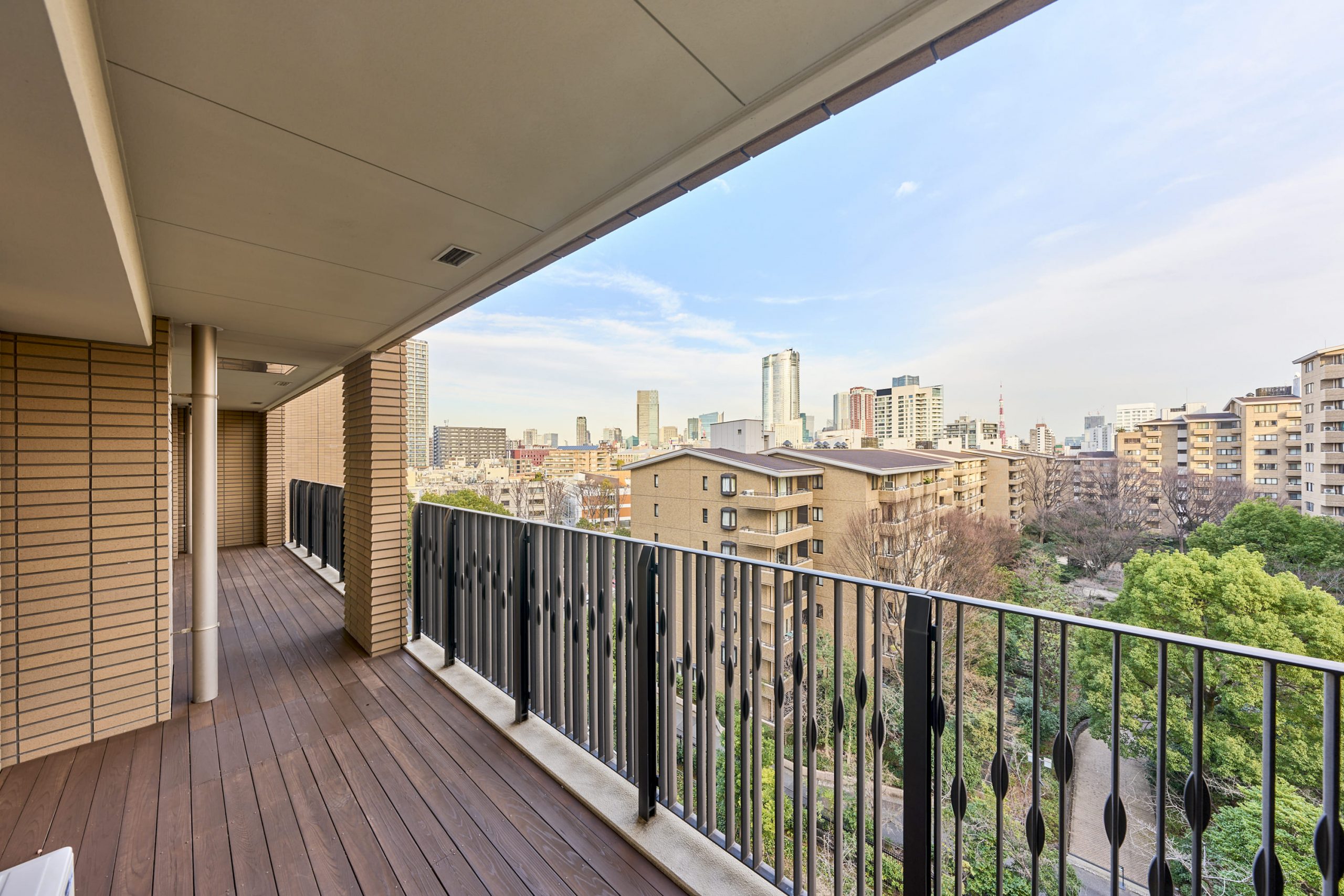 約28.69㎡の広々としたバルコニー。東向きのため、午前中から気持ちの良い陽が入りそうです。チェアなどを置いて、ほっと一息つける憩いの場に◎。また、目の前には敷地内の緑、遠くの空には東京タワーが望めます。落ち着いた街並みの中に赤い東京タワーが美しく映え、時間によって異なる贅沢な眺めを自宅のバルコニーから楽しめます。