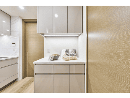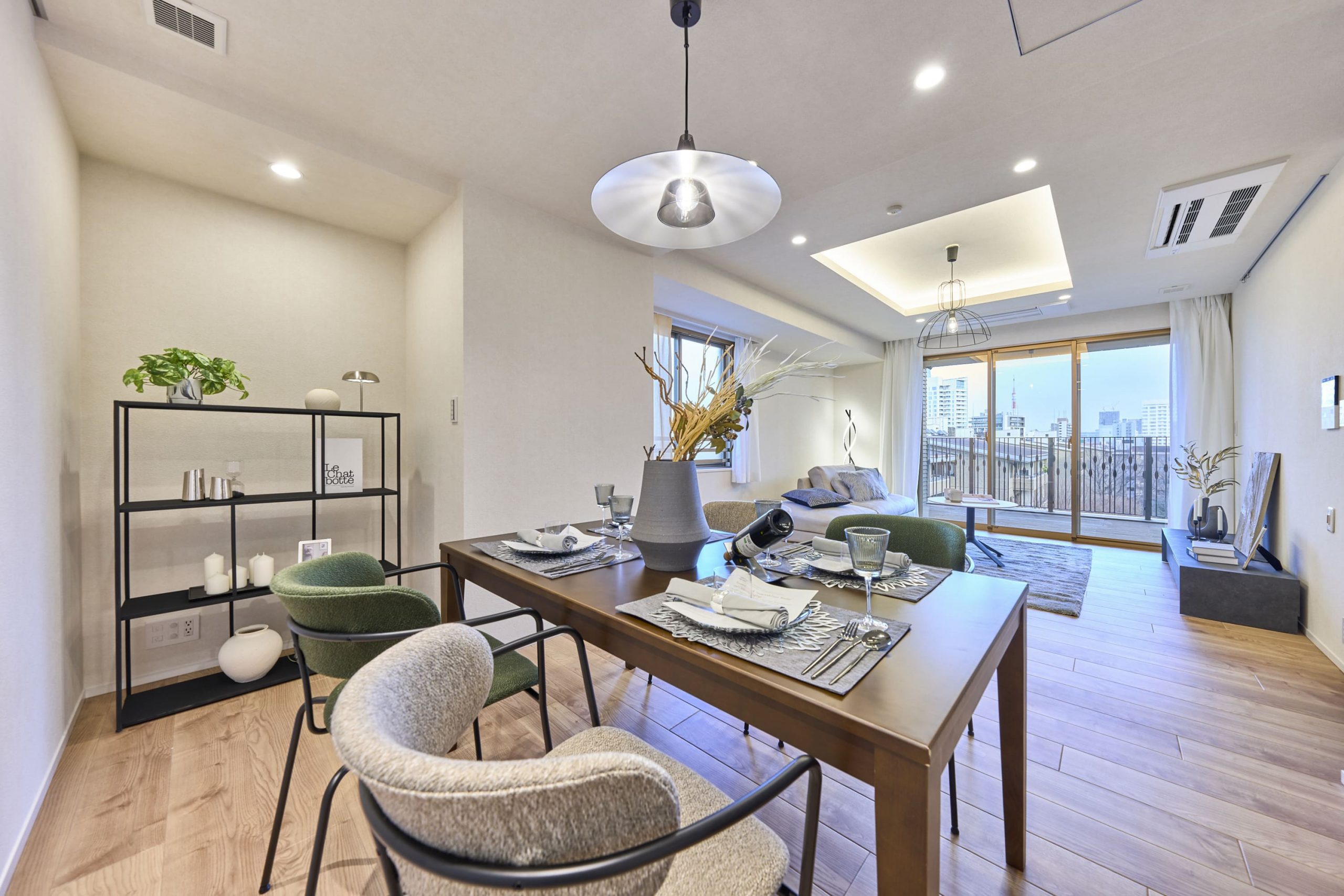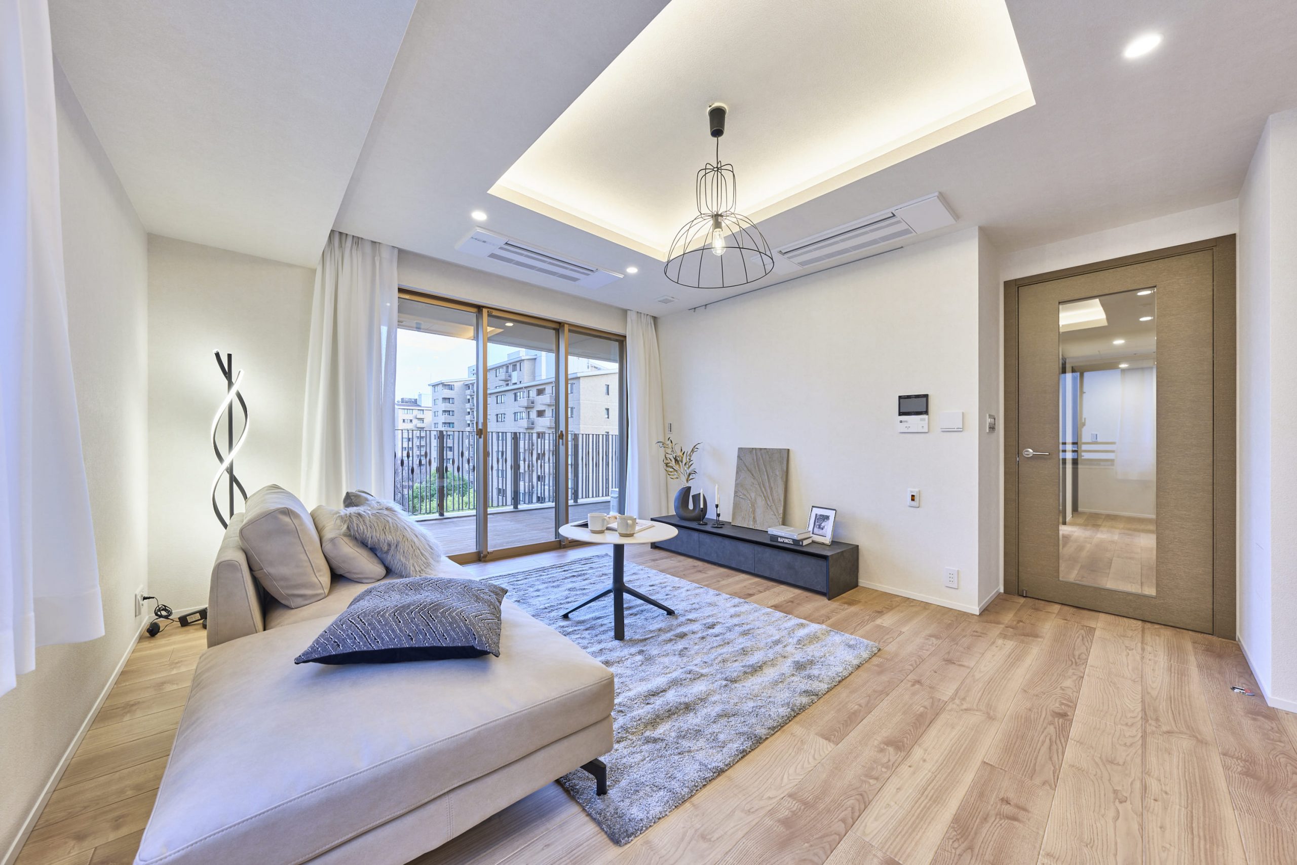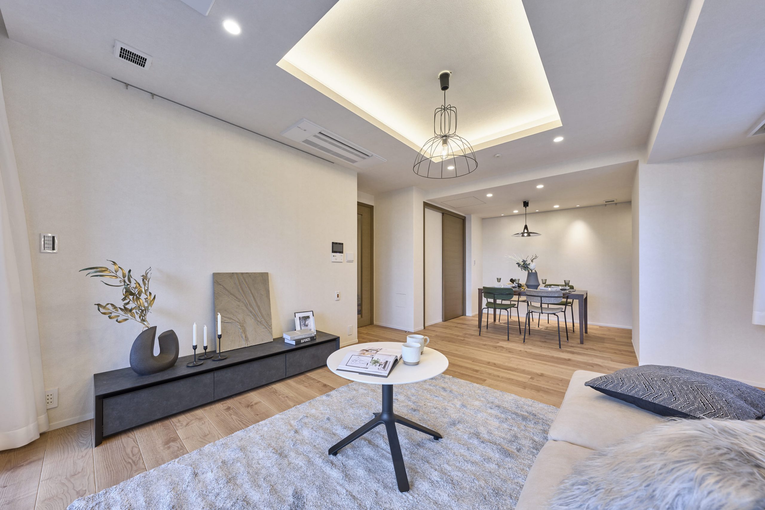 約17.6帖の広々としたリビングダイニングキッチンです。二面採光のため風が通る空間、折り上げ天井には間接照明があしらわれていて、上品な雰囲気が漂っています。また、さりげなく空間分けがされており、それぞれの時間を堪能できるのも◎。