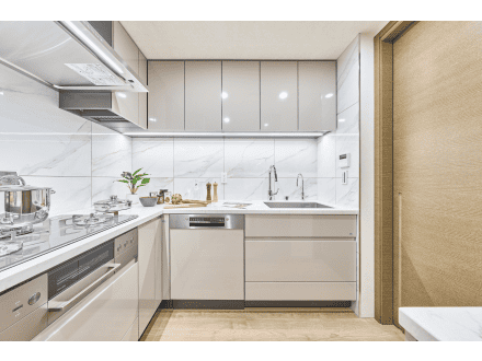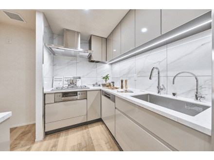 動線が最小限に済んで料理が捗るL型キッチンは、3口コンロ、グリル、食洗機付きと設備面も充実しています。食洗機は大型を採用しているため、後片付けの手間を軽減することができますよ。