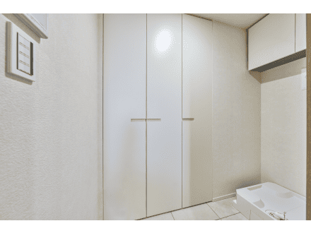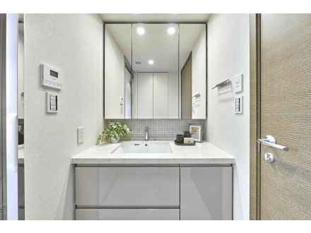 三面鏡の中に化粧品などが収納できて使い勝手良好な洗面化粧台です。背面側には棚が造られているので、ごちゃごちゃしがちな洗面まわりをきちんと整頓することができます。