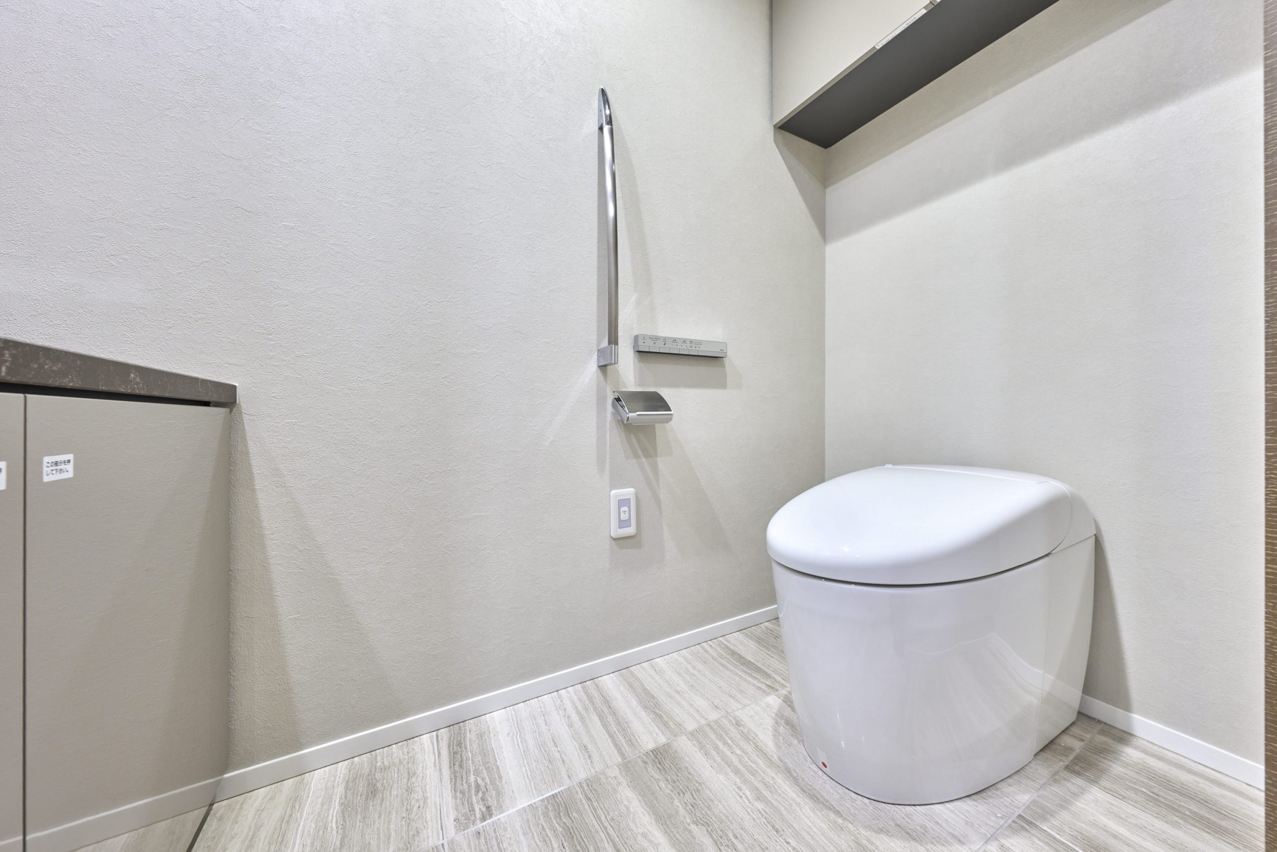 ウォシュレット一体型のトイレです。タンクレスタイプなのですっきりとした印象に。また、別途で手洗い器が造られているので、すぐに手を洗うことができて衛生的です。上部には吊戸棚が設置されていて、収納スペースもありますよ。