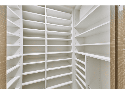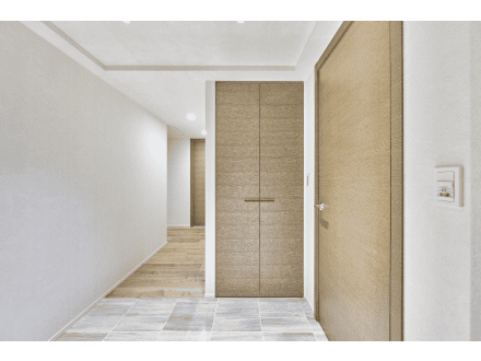 ゆとりがあって荷物を持っていても出入りがしやすそうな玄関です。入って右側には約1.3帖のシューズインクローゼットがあり、たくさんの靴を収納できるようになっています。さらに、玄関収納も造られており、収納スペースがしっかりと確保されています。