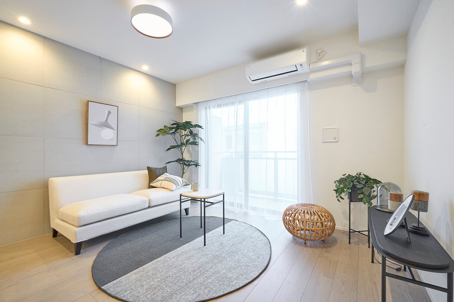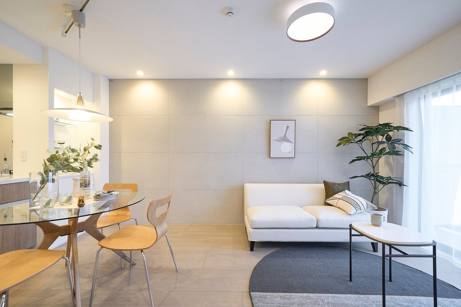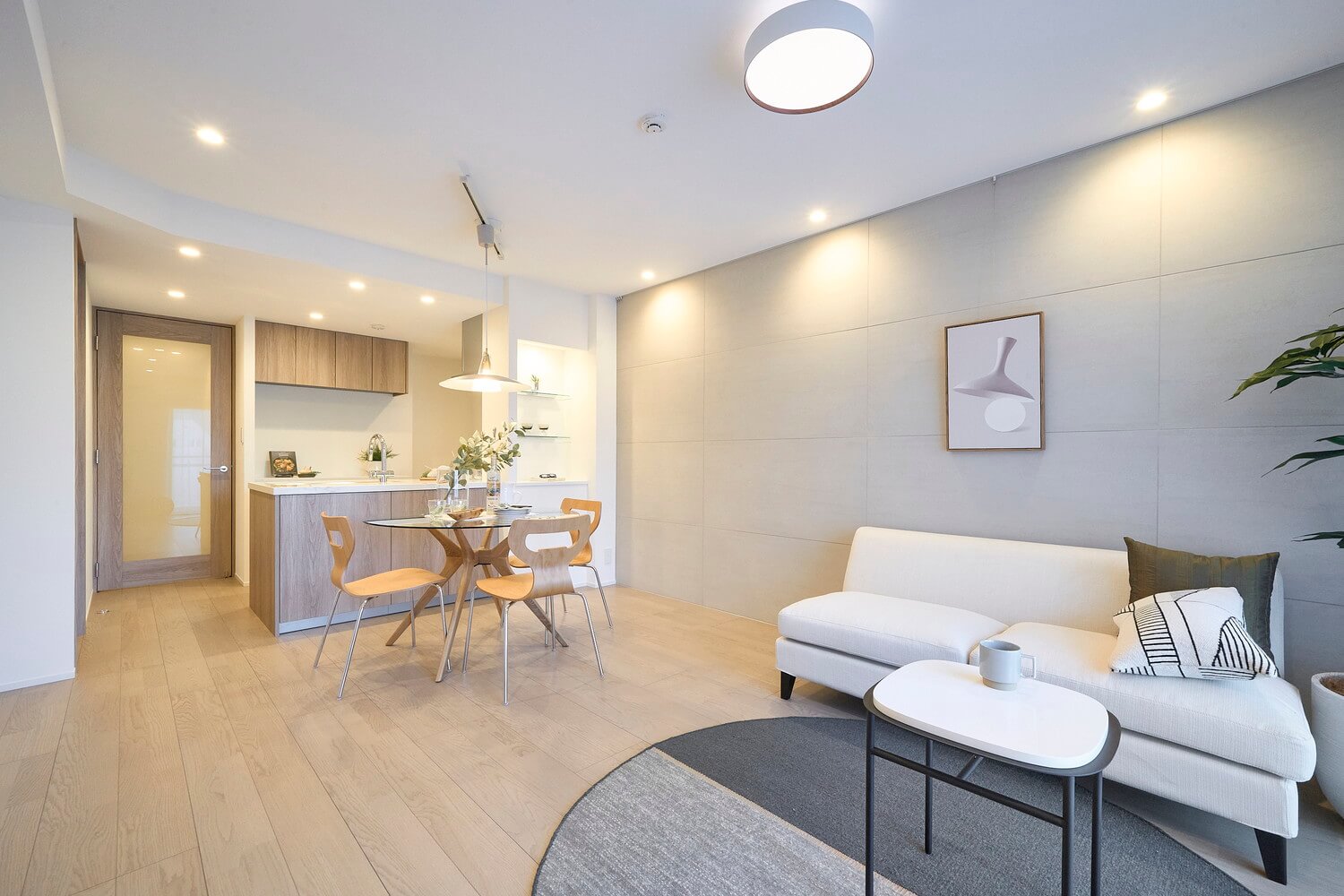 キッチンスペースを含め、約14.9帖のLDK。タイル調のアクセントウォールが施されたお洒落な空気感。ピクチャーレールが設置されていて、壁をキズ付けずにアートや写真が飾れます。方角は南東向きで陽当り良好。バルコニーへの出入りもできます。リビングの一角には収納スペースも備わっています。