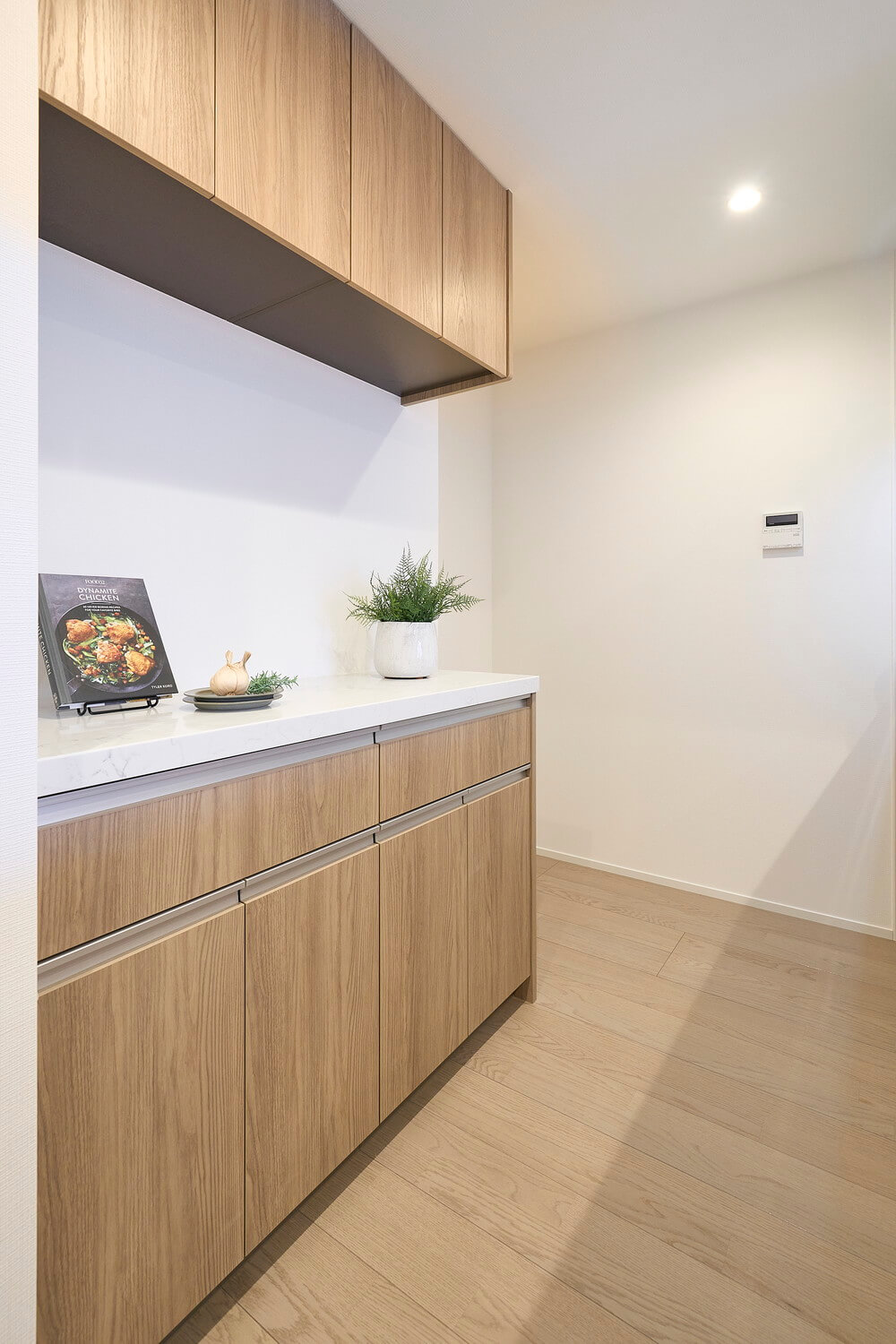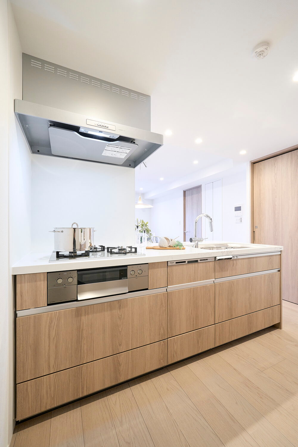 家族やゲストとコミュニケーションが取りやすいセミオープン型のシステムキッチン。料理が捗る3口ガスコンロ、家事の時短に心強い食洗機付きです。カップボード付きで収納スペースもしっかりと確保されています。ウッド調であたたかみのあるデザインがポイントです。