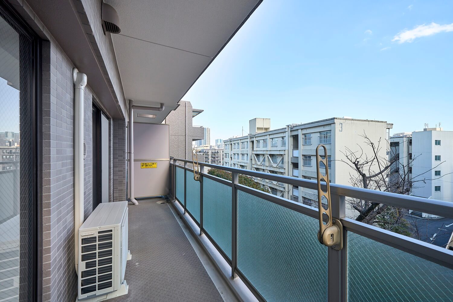 リビングダイニングと洋室に面したバルコニー。約9.00㎡ほどの広さです。方角は南東向きで陽当り良好。バルコニー目の前は見晴らしのいい景色となっています。