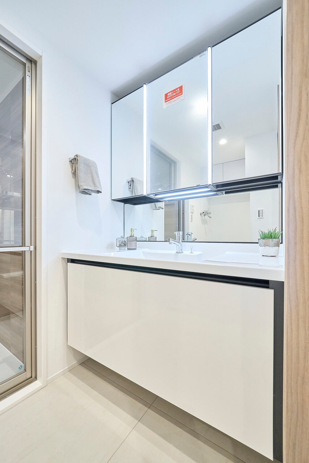 リビングから直接出入りできる洗面室。洗面化粧台は洗面まわりの小物がすっきり整頓できるミラーボックスや、モノの出し入れがしやすい引き出し式のキャビネット付きで使い勝手の良さもポイントです。