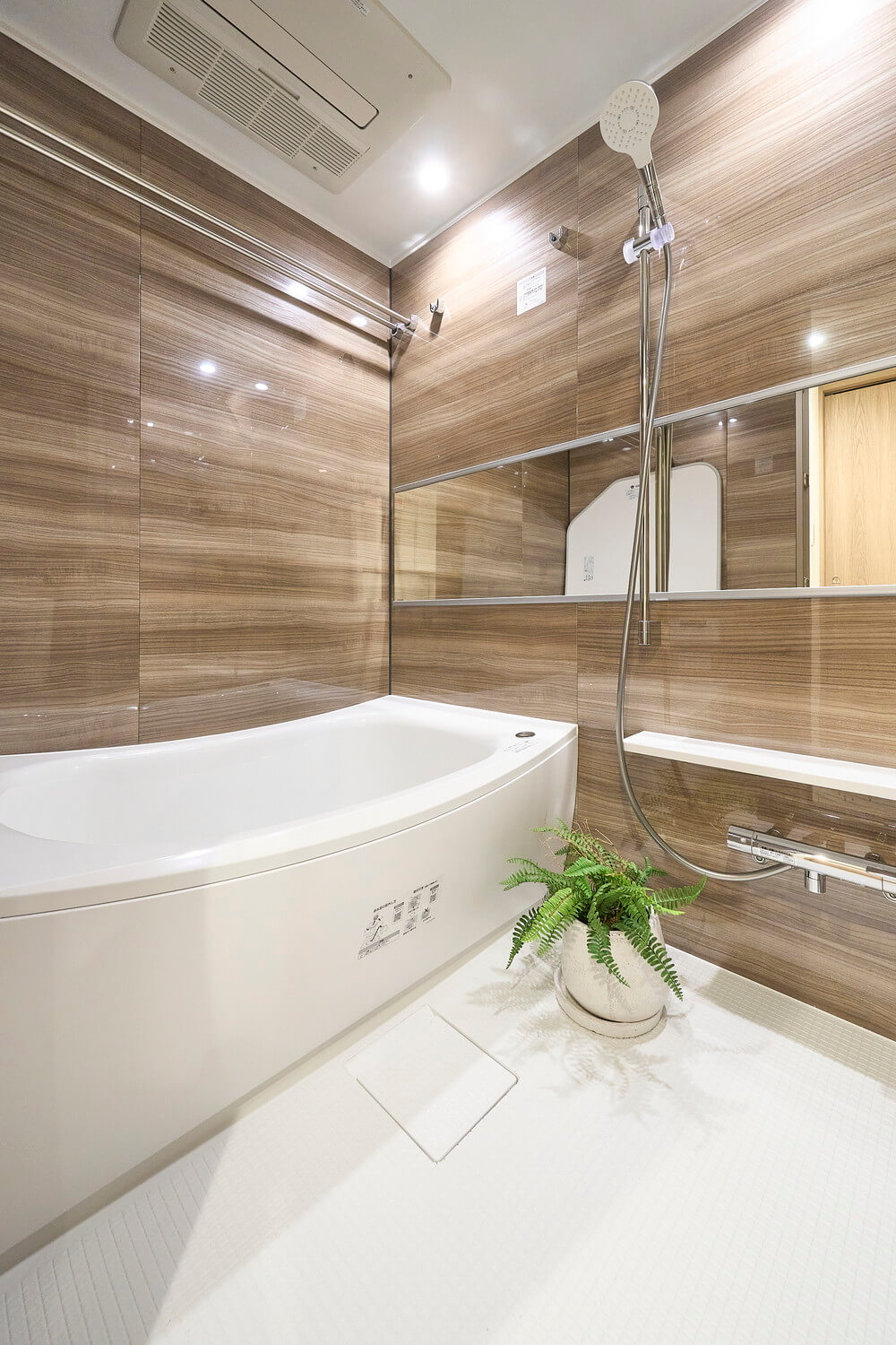 ウッド調であたたかみのある雰囲気のバスルーム。追い炊き機能の他、浴室換気乾燥機とランドリーパイプ付きで雨の日や冬場の洗濯にも困りません。