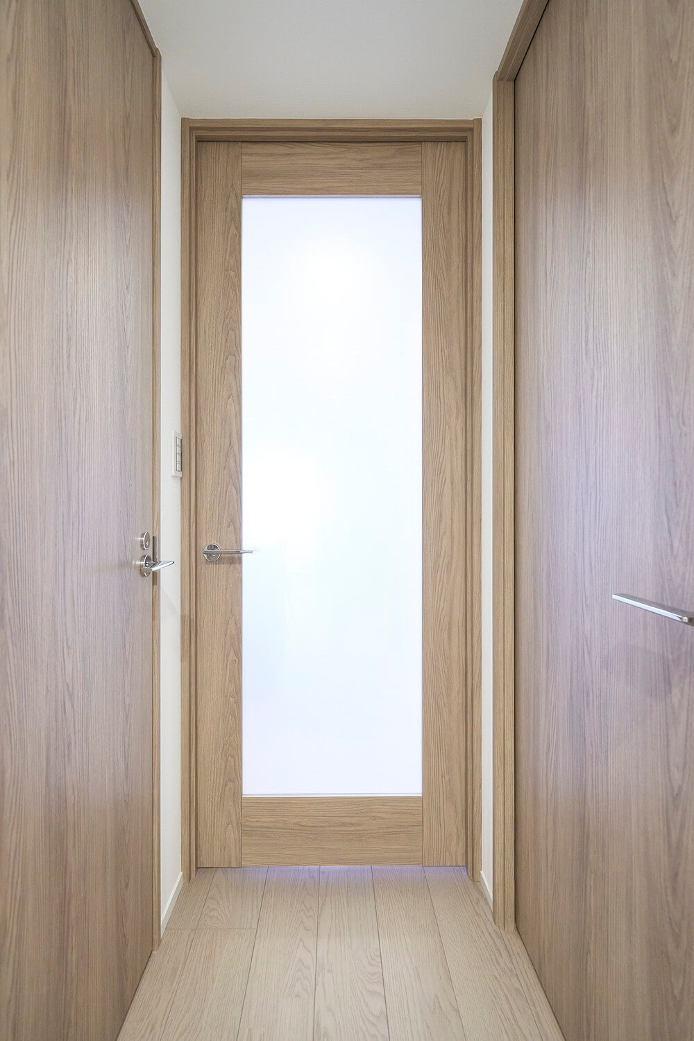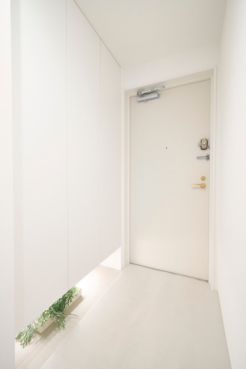 明るい印象を与えてくれるホワイトカラーで統一された玄関ホール。3枚扉のシューズボックスは足元をやさしい光で照らしてくれるフットライト付。
