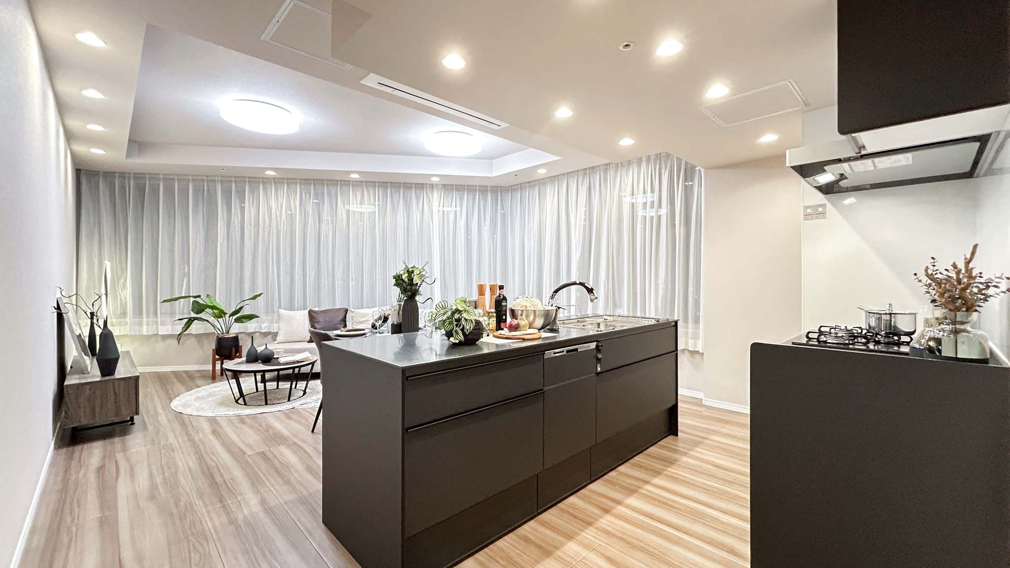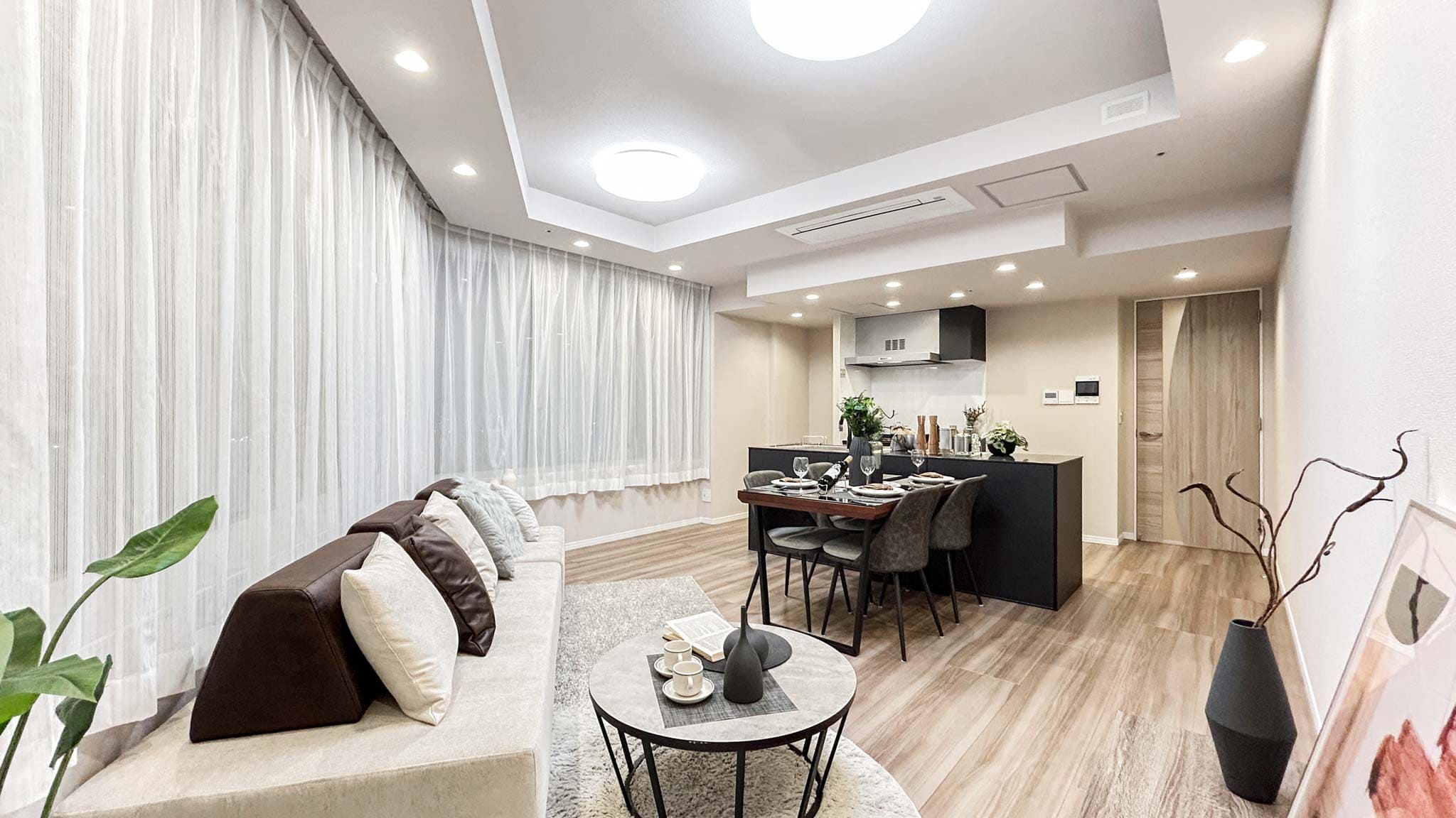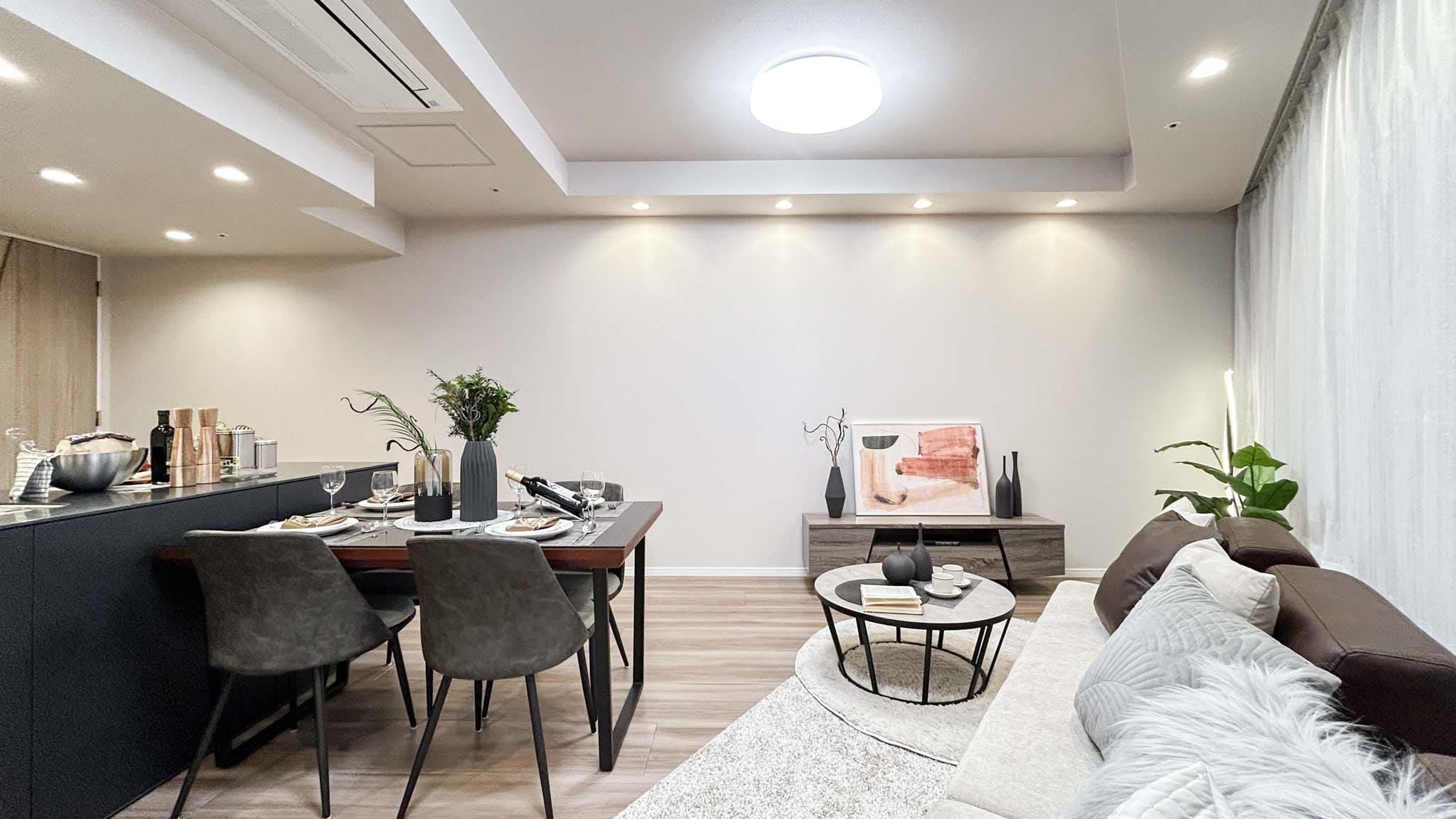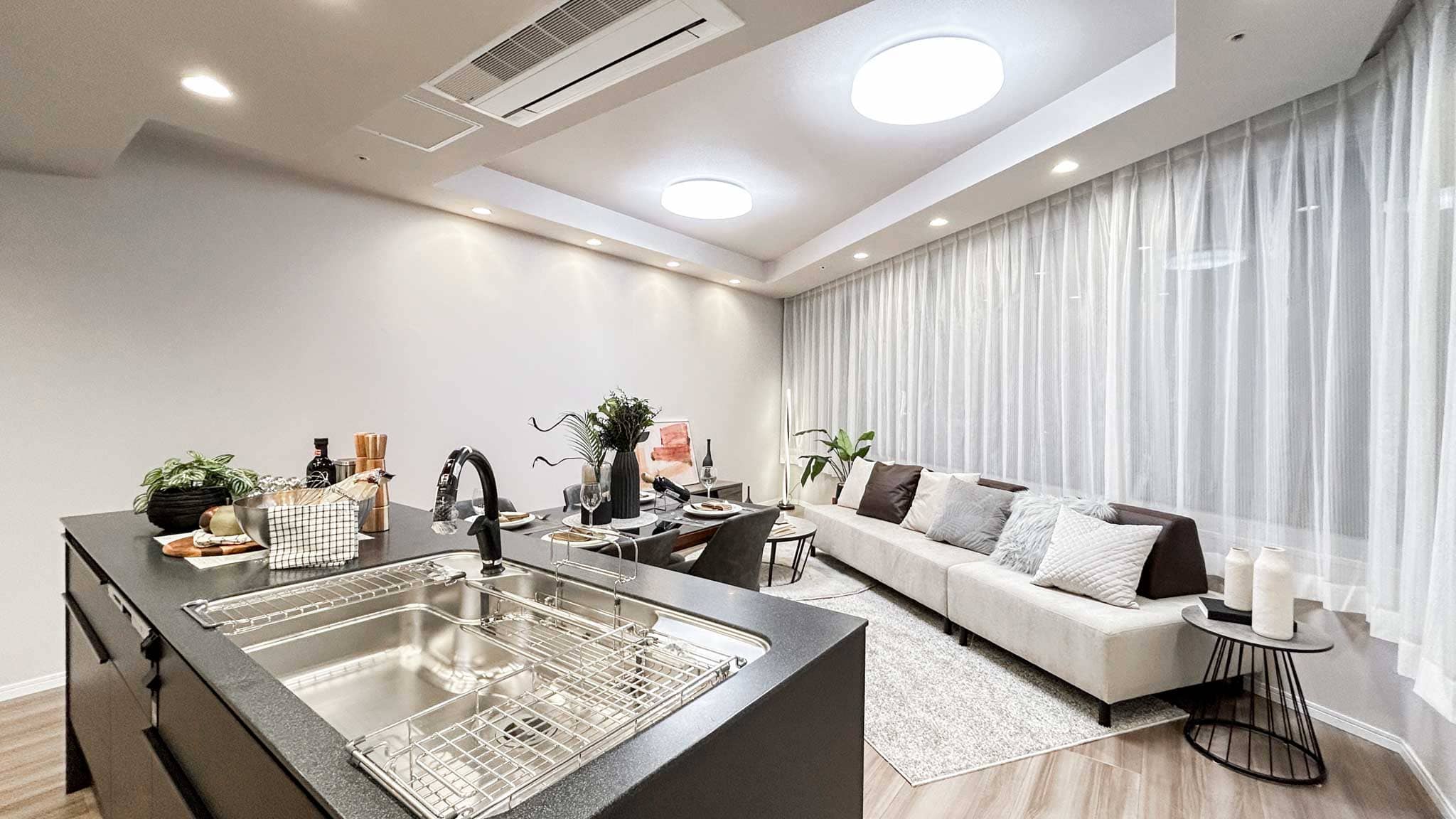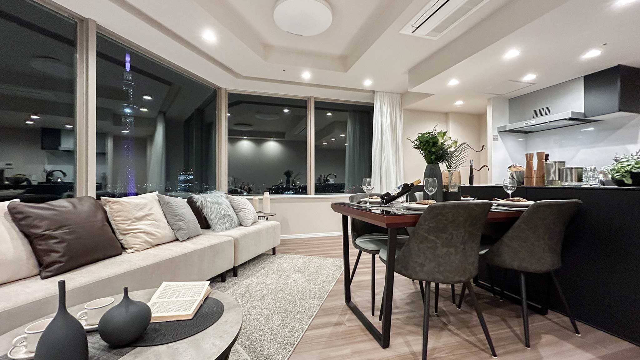約18.9帖の広々としたリビングダイニングキッチンは、窓に囲まれた開放感溢れる空間。東京スカイツリーが存在感を放ち、夜には幻想的な景色を楽しむことができます。天井は折り上げ天井になっていてお部屋に奥行きをもたらし、エアコンは埋め込み式のため、すっきりとした印象にしてくれますよ。