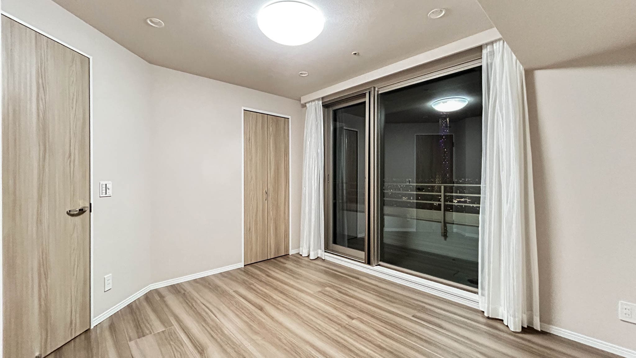約7.1帖の寝室1は、ゆとりがあって主寝室に良さそうなお部屋です。クローゼット付きで収納スペースが確保されています。窓からはバルコニーにアクセスができ、夜になると主寝室からロマンチックな夜景を堪能できます。