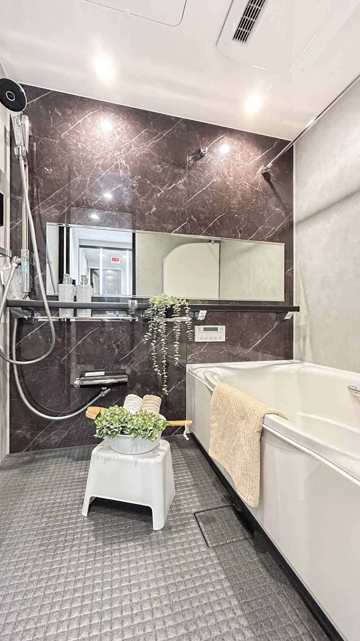 重厚感のあるバスルームです。ワイドミラーで奥行きが生まれ、浴室乾燥機も搭載されているので、雨の日の洗濯物にも困りません。