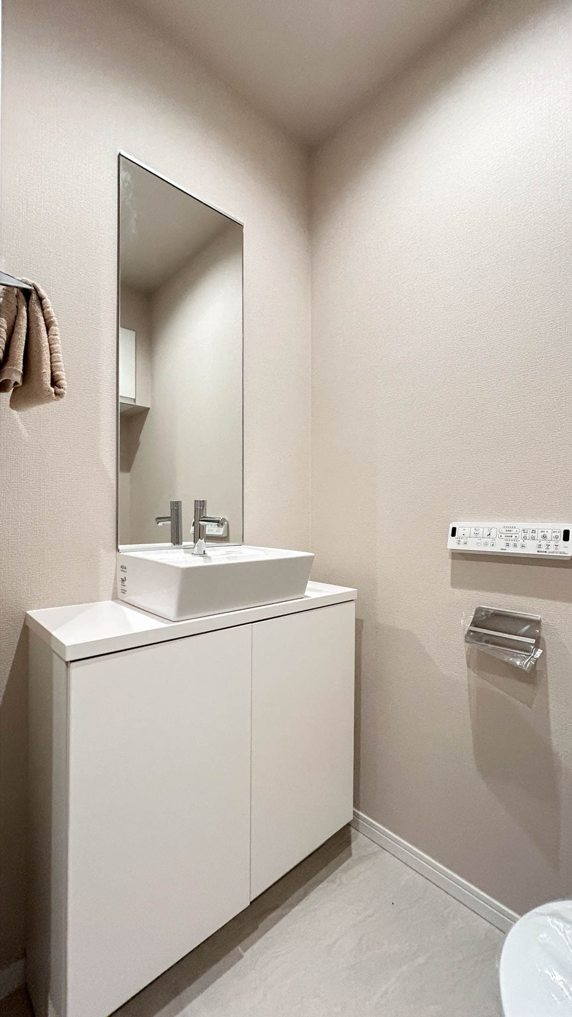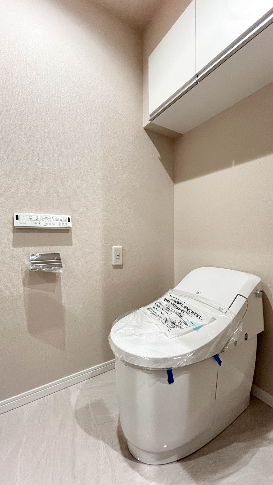 ウォシュレット一体型のトイレです。タンクレスタイプなのですっきりとした印象に。また、別途で手洗い器が造られているので、すぐに手を洗うことができて衛生的です。上部には吊戸棚が設置されていて、収納スペースもありますよ。