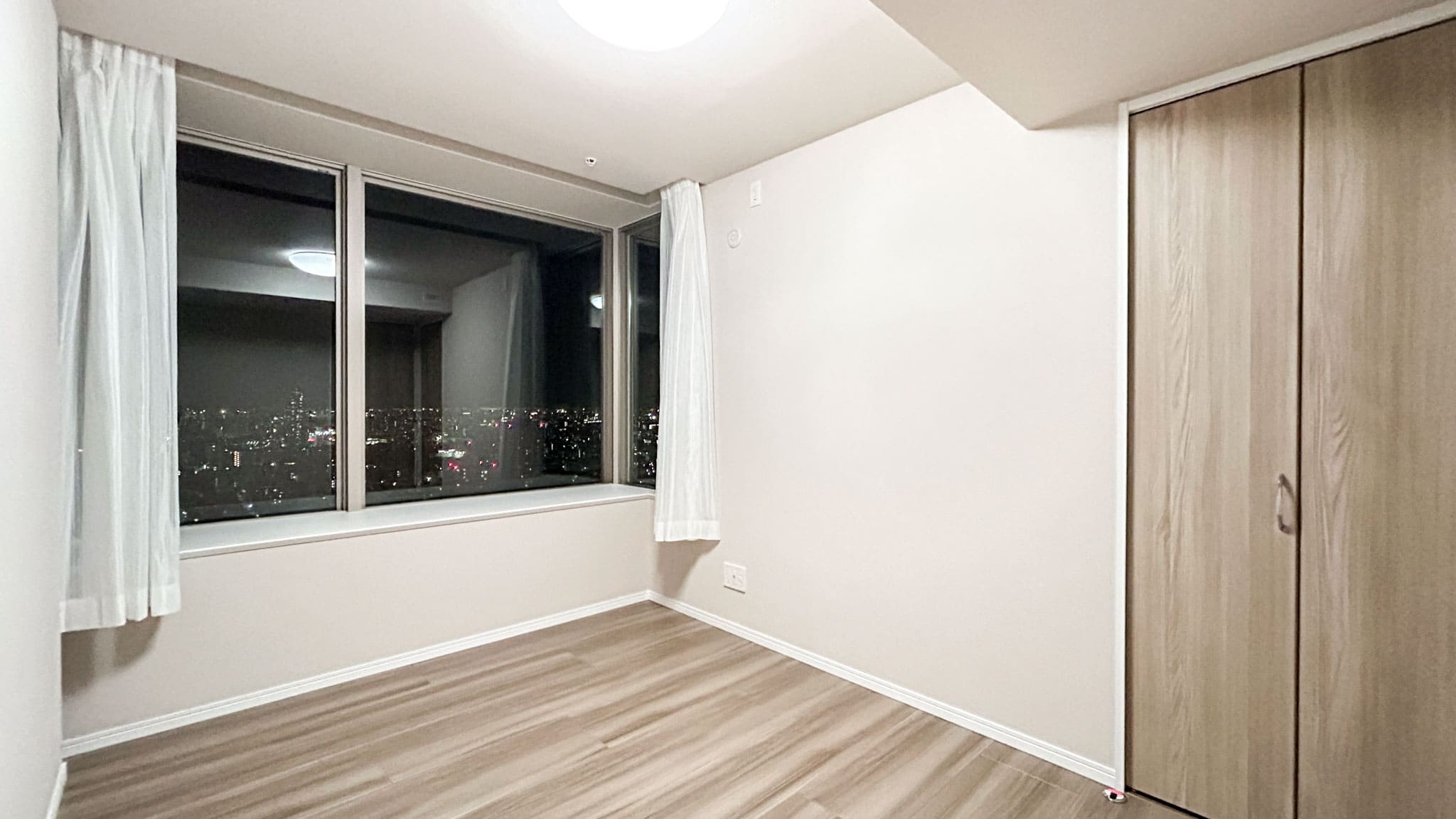 約6.4帖の寝室2は、寝室としての落ち着きに加え、デスクを置けば静かなワークスペースへと表情を変えます。窓からは遮るもののない広大な夜空が広がっています。