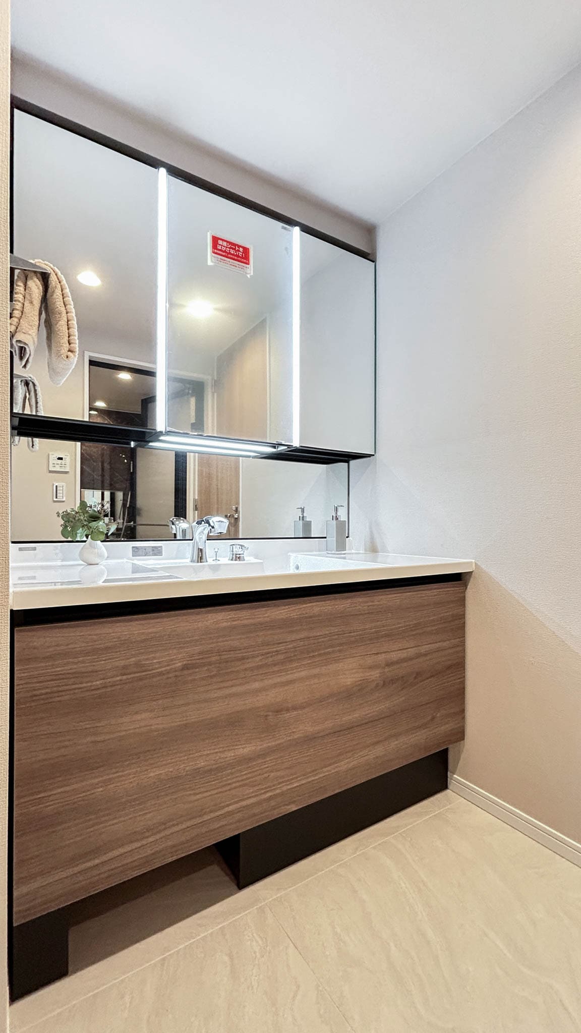 ブラックフレームがアクセントになっていてデザイン性が◎。三面鏡は中に化粧品などの小物が収納できるようになっているので使い勝手良好です。また、洗面ボウルとカウンターが一体型になっているのでお掃除が簡単です。背面側には、可動棚が設置されており、リネン類も収納可能。
